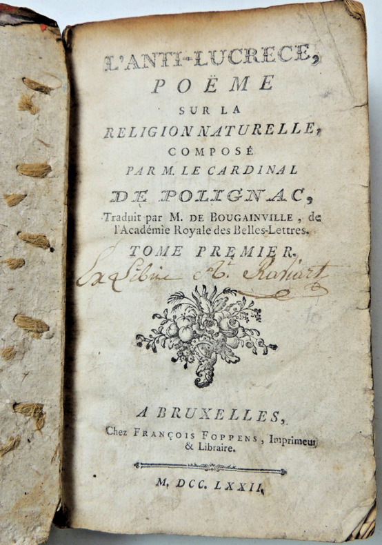 ---- "Orateur, poète, philosophe, le CARDINAL DE POLIGNAC était loin d'être étranger aux sciences physiques et mathématiques. Il fut nommé en 1715 membre honoraire des Académies des sciences... L'ouvrage qui a le plus contribué à sa réputation est le poème latin de l'ANTI-LUCRECE. Laissé inachevé par le cardinal, il fut publié (en latin) par son ami l'abbé de Rothelin avec un discours préliminaire de Lebeau... BOUGAINVILLE en a donné une traduction complète... Le désir de réfuter les objections que BAYLE empruntait, pour la plupart, au De natura rerum du poète romain, fut le motif qui engagea le CARDINAL DE POLIGNAC à prendre la plume. Ce poème renferme neuf livres. Après avoir combattu dans les premiers livres les erreurs d'EPICURE sur le vide et les atomes, et cherché à établir que le mouvement, n'étant pas propre à la matière, suppose une cause première, il démontre la spiritualité et l'immortalité de l'âme, en un mot les grandes vérités du spiritualisme chrétien. Amené à parler de l'âme des bêtes, il penche vers le méchanisme de DESCARTES. Les deux derniers livres sont consacrés aux preuves de l'existence d'un premier Etre intelligent et juste... Il faut louer l'auteur, qui, avec des intentions religieuses, se contente d'invoquer partout les raisons, d'avoir embelli les vérités les plus abstraites des charmes de la poésie, et emprunté une foule de détails neufs, ingénieux aux sciences et aux arts, à l'histoire et à la fable. Il prend souvent à Lucrèce des traits énergiques ou brillants qu'il retourne contre lui...". (Hoefer T. 40)**75410/7541/P2