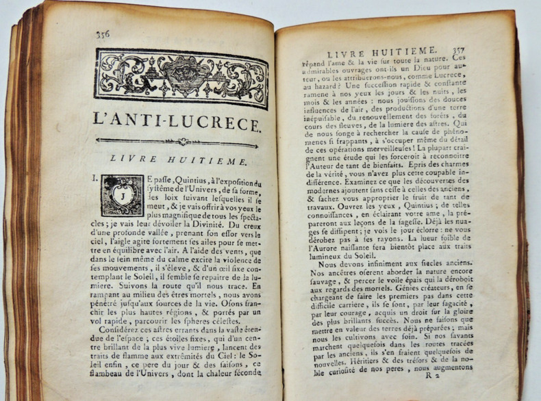 Bon état complet 2 tomes en 1 - reliure plein veau dos bien orné coiffe du haut pts manque plats un peu frotté coins un peu usagés sinon bel état - traduit par M. de Bougainville, de l'académie royale des belles-lettresAdversaire de l"athéïsme contemporain et du système d"Épicure maître de Lucrèce, Polignac, en ardent défenseur de Descartes, fait ici sienne la preuve de l"existence de Dieu et de l"immortalité de l"âme. Cette édition bruxelloise Cette traduction de Jean-Pierre de Bougainville fut publiée d"abord en 1749. Ce poème philosophique fut composé par le cardinal à la suite d"une dispute avec Bayle. L"ecclésiastique y réfute le ""De natura rerum"", de Lucrèce sur lequel s"appuyait Bayle pour justifier son scepticisme, et développe quelques théories de Descartes sur l"univers et le machinisme. L"ouvrage, resté inachevé à la mort de l"auteur, fut complété par l"abbé Rothelin et le professeur Lebeau. :: Les deux tomes sont à pagination continue mais avec pages de titre séparées.