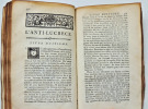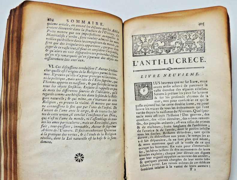 Melchior de Polignac était Cardinal et diplomate français du XVIIIe siècle. Le livre est une réponse directe au matérialisme et à l’athéisme de Lucrèce (De Natura Rerum). L'auteur défend une vision théiste et spiritualiste du monde et met en avant une religion naturelle, accessible par la raison.Réfuter les doctrines épicuriennes. Il tente de prouver, par la poésie et la raison, l’existence de Dieu et l’ordre moral de l’univers Traduction en prose de Pierre de Bougainville (parue pour la 1ère fois en 1749). Ce poème néo-latin de plus de 10 000 vers fut composé dans les dernières années du XVIIème siècle. C'est une critique des idées religieuses de Pierre Bayle et de ses disciples. La première édition fut publiée seulement en 1745. Ex libris manuscrit en page de titre Complet deux tomes en un volume fort in8, 17x10cm, reliure pleine basane époque avec accrocs et manque, bon état intérieur, manque de la dernière page table des matières, 178, 460pp. Bruxelles, François Poppens, 1772 ref/22/1