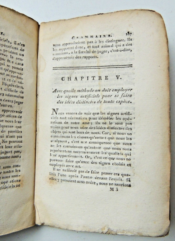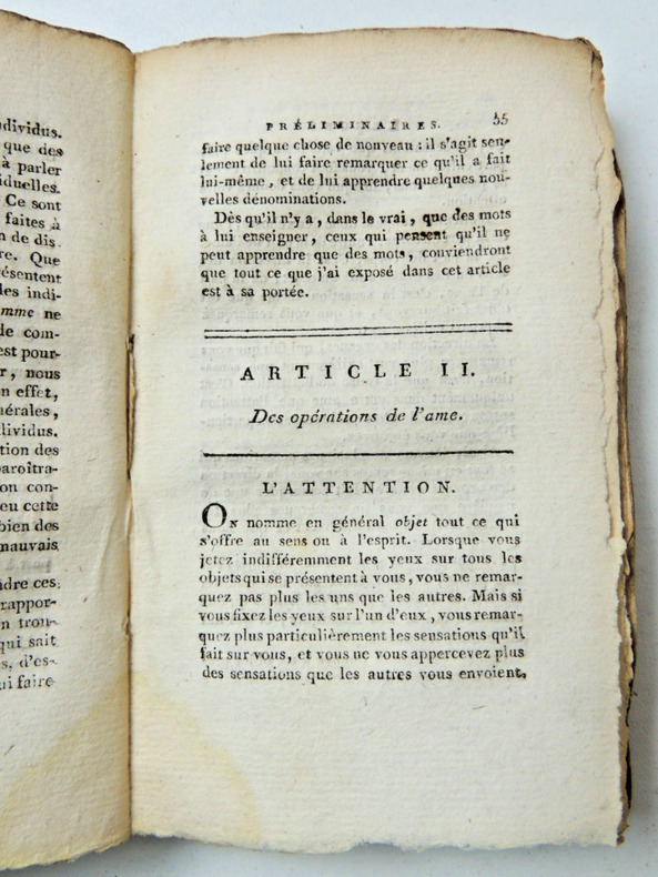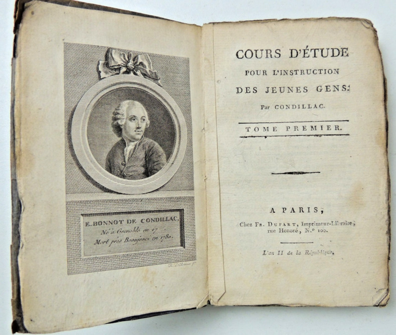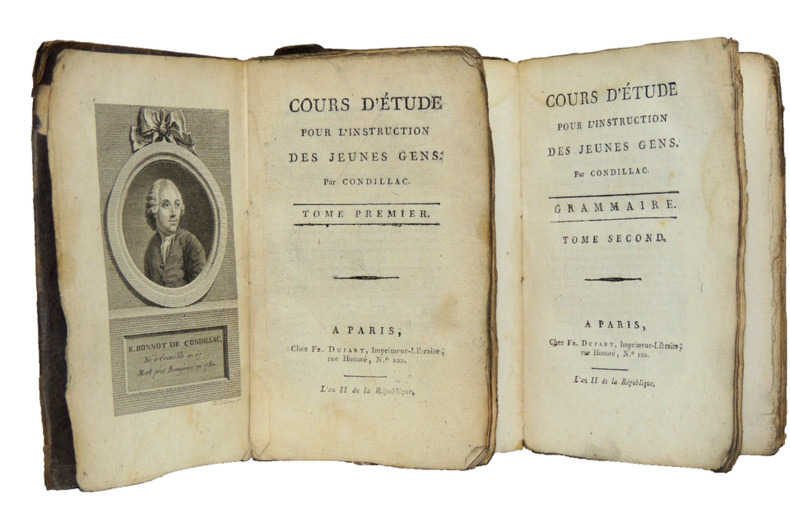ambitieux projet pédagogique, didactique, historique et philosophique de l'abbé de Condillac, destiné à l'éducation des enfants. Les volumes rassemblent la grammaire, Condillac développe les idées qu'il avait exposées dans l'Essai sur l'origine des connaissances humaines et dans le Traité des systèmes. Complet deux volumes reliés, 14x9cm, couvertures d'attente, bon état intérieur, portrait en frontispice, 224, 205pp. Paris, Chez Dupart, An II ( 1793-1794) ref/22/1