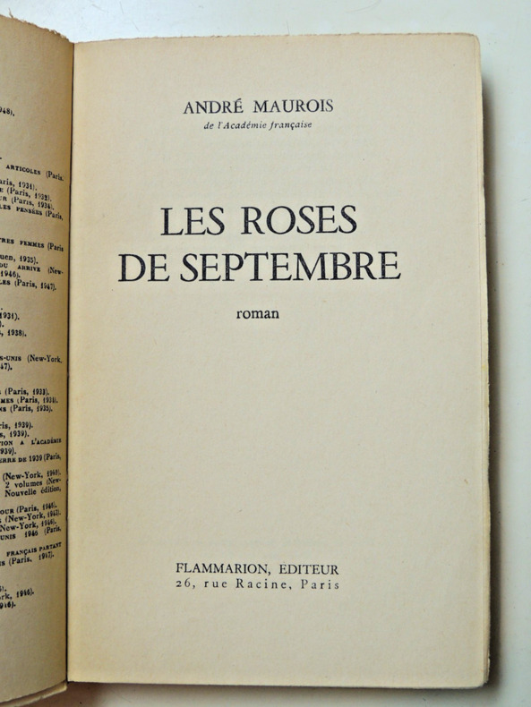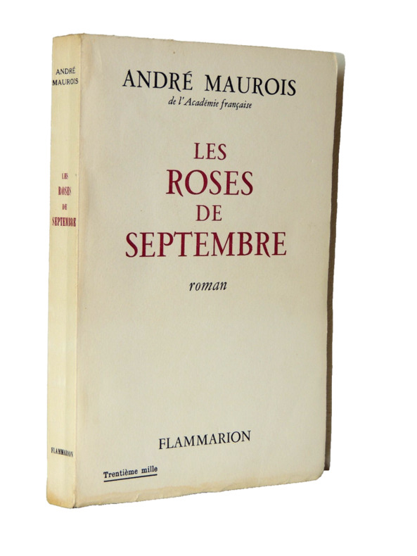 Les Roses de septembre est un roman d'André Maurois paru en 1956 chez Flammarion, évoquant les malheurs conjugaux d'un auteur vieillissant, Guillaume Fontane, séduit à nouveau par une femme beaucoup plus jeune que lui lors d'un voyage en Amérique latine vol in-8, 190x120, relié demi cuir, frottements sur les mors, dos à nerfs, tranche de tête dorée, 252 pp. Couvertures d'origines conservées, fausse mention de quarantième mille sur la couverture. Flammarion achevé d'imprimé le 1 septembre 1956. Edition originale ref/158