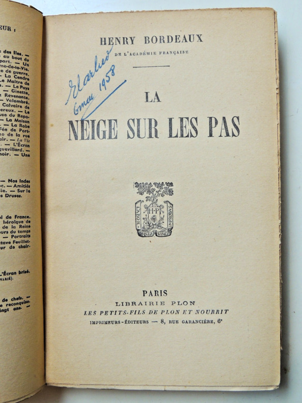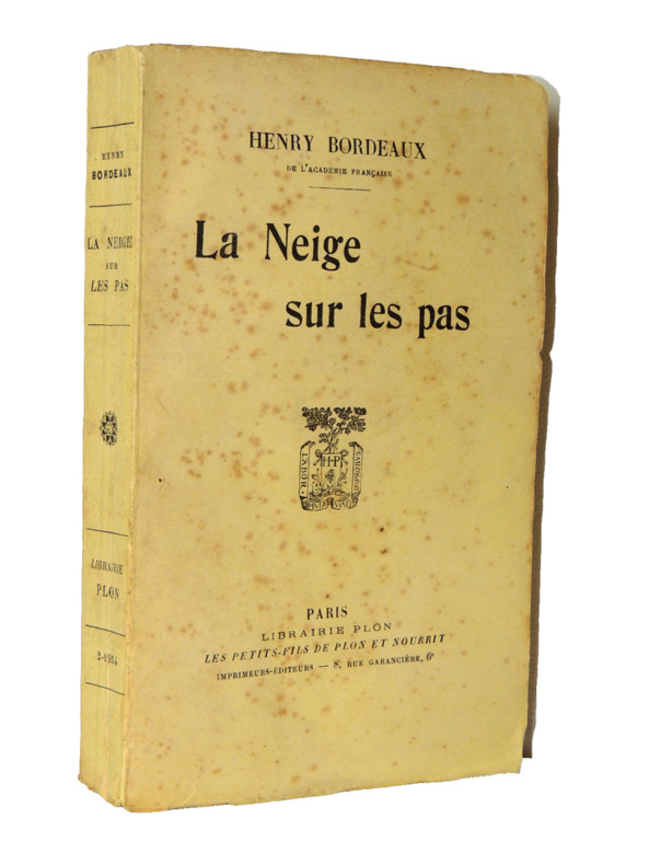 Enrichi d'une carte autographe signée de Henry Bordeaux datée du 21 juin 1929, Boulevard Beauséjour. L'amour est, comme toute chose, subordonné aux lois de la vie. Il ne doit pas s'y dérober. C'est pourquoi la neige tombe à nouveau, pour effacer les pas et faux pas qui ont pu la souiller. Un grand livre sur le pardon et sur la vie, à l'opposé de « ces visions romantiques, qui nous représentent l'amour comme un mal dont on ne guérit jamais ». Un roman sentimental, mais aussi un roman sur le pardon et sur les moeurs. L'auteur dépeint avec justesse le milieu bourgeois du début du XXe siècle vol relié demi cuir, 18x13, bel état intérieur, 448pp. Couvertures conservées. Paris, Plon 1911. Edition Originale. ref/162