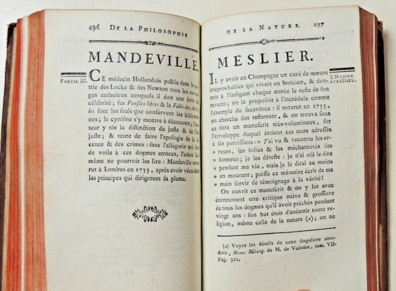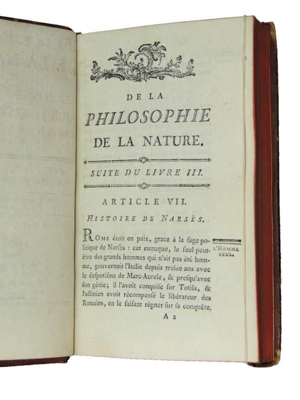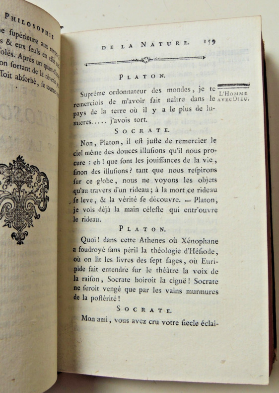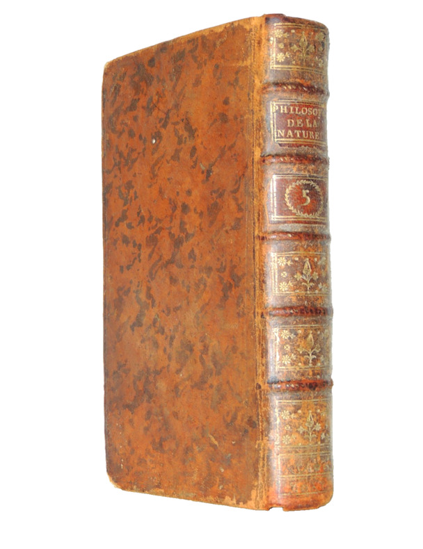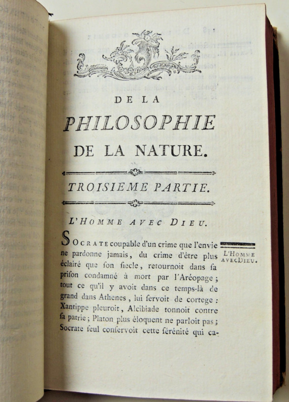 Tome V, ( suite du livre III), histoire de Narcès, des plaisirs solitaires, du suicide, du terme de la vie, l'homme avec Dieu, dialogue avec Platon, des erreurs humaines sur l'essence de Dieu, de la superstition, des cultes.. Vol in8, reliure basane époque, accrocs, 19x10cm, frais, tranche rouge, 410pp. Ouvrage recherché. à Londres, se trouve dans la plupart des capitales, 1778 ref/26