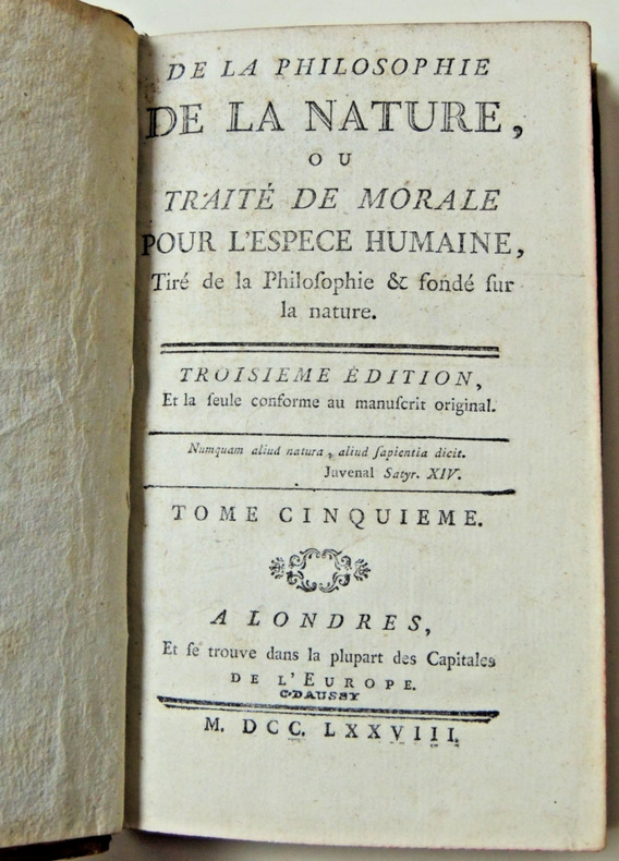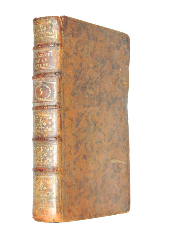 Tome III, ( suite du livre II), des sens, des passions, dialogue du Parisien et Caraïbe, de l'amour, de l'ambition + Du corps humain; molécules organiques, perceptions élémentaires, etc.. Vol in8, reliure basane époque, accrocs, 19x10cm, frais, tranche rouge, nombreux passages surlignés, 383pp. Ouvrage recherché. à Londres, se trouve dans la plupart des capitales, 1778 ref/26