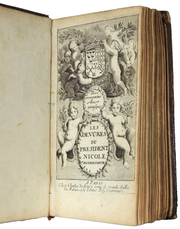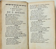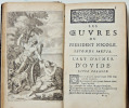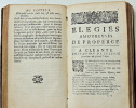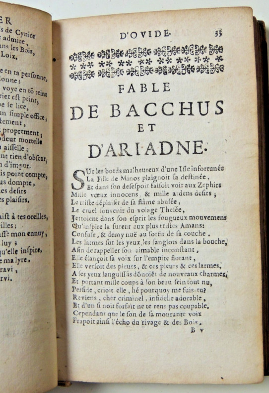 Contenant diverses pièces choisies, traduites en vers Français d'Ovide, Horace, Martial, Anacréon, Catule, Properse. Les satyres de Juvénal et de Perse, Les amours d'Aenée et de Didon, de Virgile, Proserpine, poème de Clodian, Les amours d'Adonis, poème du cavalier Marin. vol in8, reliure basane époque, accrocs, 16x10cm, assez frais, page manuscrite en fin de volume ( 1757). 1 gravure en frontispice et 1 hors-texte illustrant L'Art d'aimer d'Ovide à Paris, chez Claude Prudhomme, 1705 ref/26