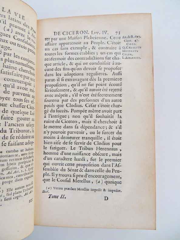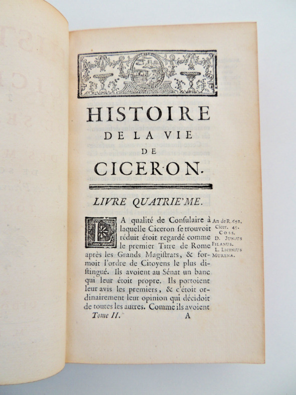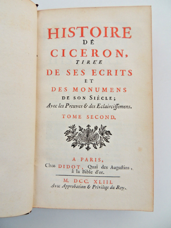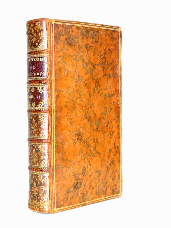Né le 3 janvier 106 avant J.-C. à Arpinum (Italie) et mort le 7 décembre 43 avant J.-C. à Caieta (Italie), Marcus Tullius Cicero, dit Cicéron, est un homme d'État romain et un auteur latin. Venant d'une famille aisée et respectée, il étudie dès son plus jeune âge la philosophie grecque et exerce la profession d'avocat dès 80 avant J-C. Il complète plus tard son éducation par des cours de rhétorique, qu'il suit en Grèce. Grand orateur, politicien et philosophe, il fut assassiné sur ordre de Marc-Antoine. En 75 avant J-C, il débute sa carrière politique en devenant questeur en résidence à Lilybée. Au cours de sa vie, il va monter petit à petit les échelons. C'est en août 70 avant J-C, grâce à son intervention dans le procès contre Verres, un ancien propréteur corrompu, qu'il confirme son entrée dans la vie politique et judiciaire. Il obtient de nombreuses preuves en Sicile contre lui, ce qui lui permet d'être élu édile, puis, lors du procès, défend les Siciliens avec conviction et fait tomber Verres, malgré la défense de l'illustre orateur Hortensius. En 69 avant J-C, il suit son cursus honorum comme édile puis il devient préteur en 66. Dès son deuxième discours, celui-ci s'intitulant Pro Roscio Amerino, en 80 avant J-C, il connaît le succès en tant qu'orateur. Il part ensuite en Grèce pendant deux ans pour sa santé, où il complète son éducation auprès des figures de la philosophie vivante. Tout au long de sa vie, ses discours et ses plaidoiries affirmeront ses qualités d'orateur, qui feront son succès. Les Verrines et les Catilinaires sont les plus retenus parmi ses discours. Tome II : Livre IV-VI. 45- Junius Filatus - 55 - Pompéi le grand vol in-12, 170x100, reliure pleine basane époque, bon état intérieur, bien frais, 485pp Paris Chez Didot MDCCXLIII ref/24/7
