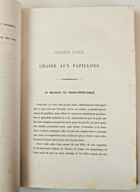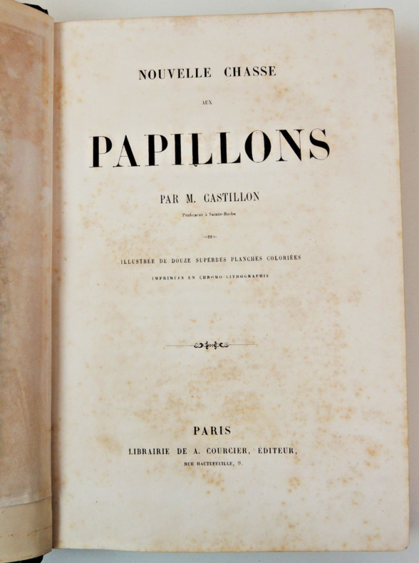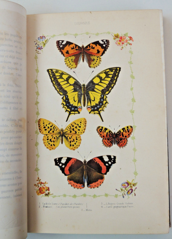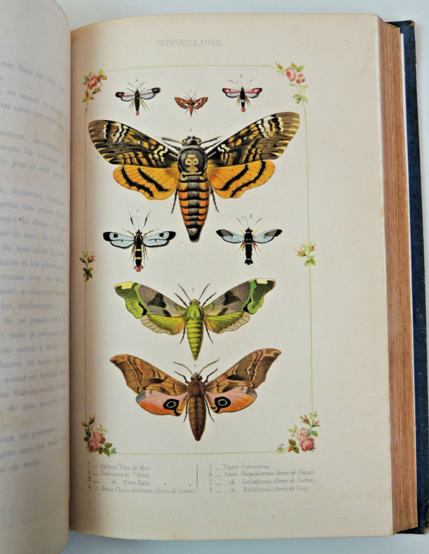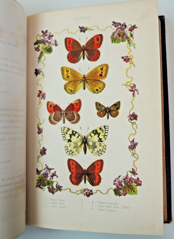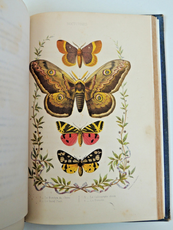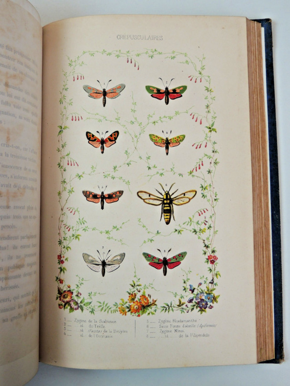 Illustré de 12 superbes planches coloriées imprimées en Chromos-Lithographie. Sommaire : la chasse aux papillons - Les crépusculaires - Les nocturnes. vol. in4, relié demi chagrin vert, frottements des plats, qq rousseurs sur les serpentes, très bel état intérieur, toutes tranches dorées, 396pp. Ouvrage recherché, peu courant. Paris, Librairie de A.Courcier , vers 1858