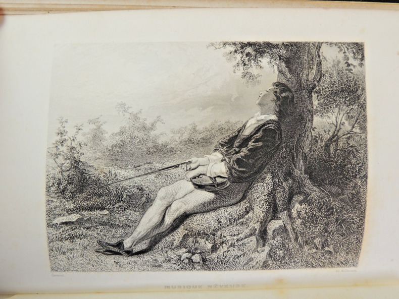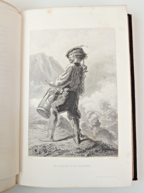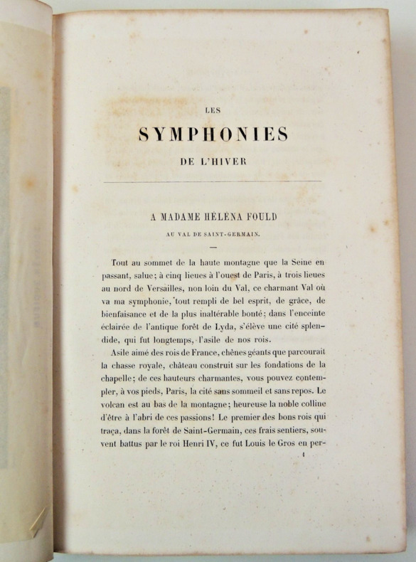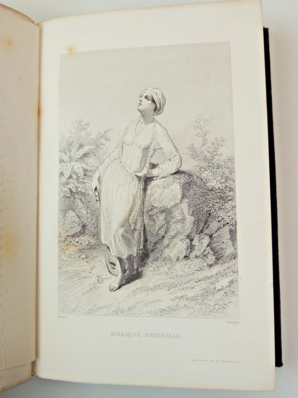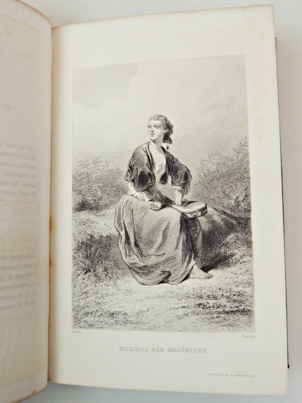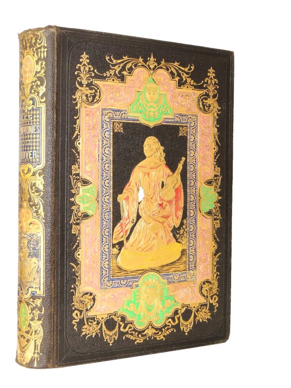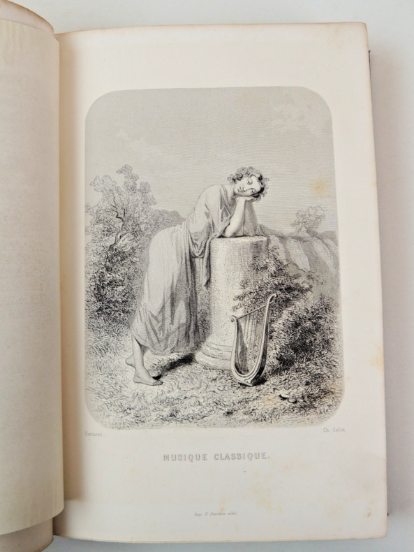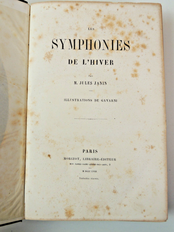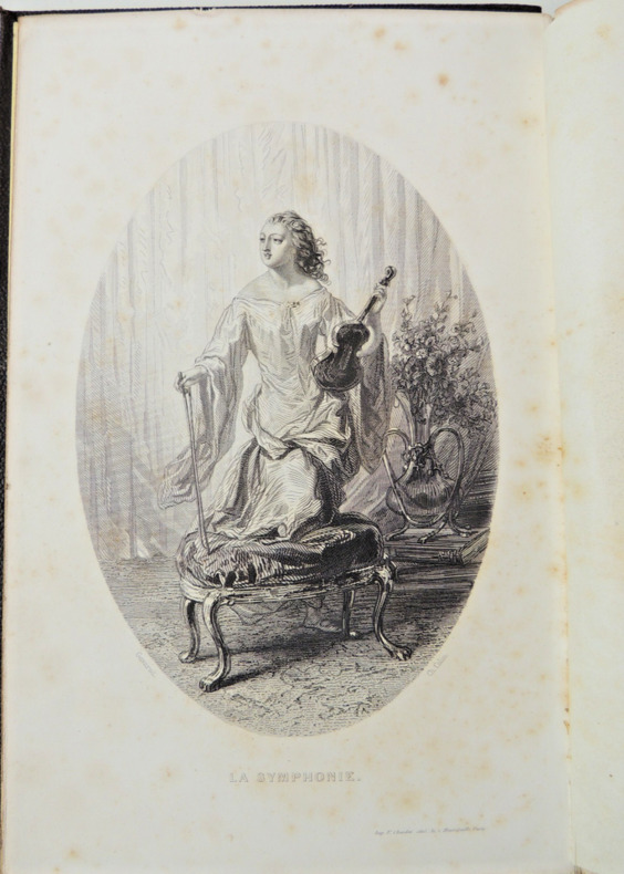 L’ouvrage qui débute par un beau Prélude de Janin rendant hommage à l’artiste se compose de 12 symphonies : À Madame Héléna Fould, Au vieux Dante, au mariage, À Beethoven, À madame de Pompadour, Aux chemins de fer, À l’Opéra, Au ballet, à la Tarentule, À madame Prevost, À l’orgue et À la guitare. avec 15 planches dont un frontispice gravées sur acier par Colin, Willmann, Rouargue et Calamata d'après Gavarni. Édition originale illustrée et premier tirage des 15 planches gravées hors-texte d’après Gavarni. vol relié dans son cartonnage éditeur, leg. usure aux coiffes, rousseurs éparses, 250x170, toutes tranches dorées, 384pp. Bon exemplaire de cet ouvrage recherché. Paris Morizot 1858