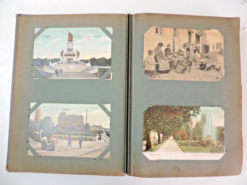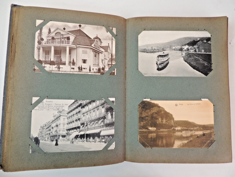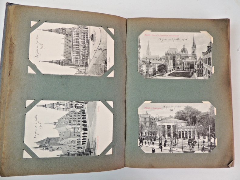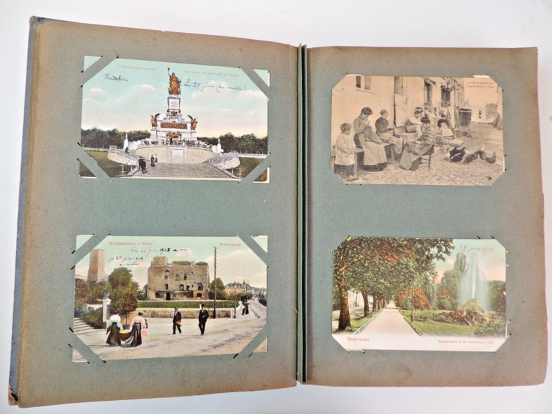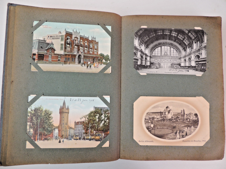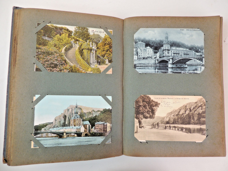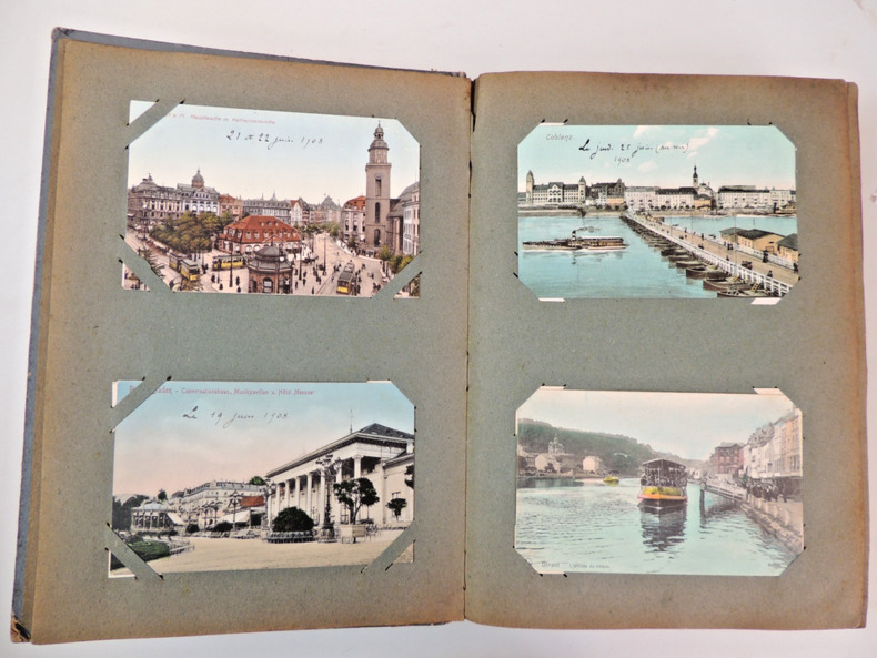 format 28x20cm, relié percaline illustrée, complet, bon état. 100 pages, soit 200 cartes postales, nombreuses en couleur avec indications des lieux et notes vers 1908/1910, quelques cartes plus contemporaines également On peu y voir; Cote d'émeraude, Baden-Baden, Dinant, Frankfurt, Belgique Exposition de Bruxelles 1910, Wisesbaden, Koln, Vallée de la Meuse, Aachen, Givet, Les ardennes, Cote d'Azur, etc..
