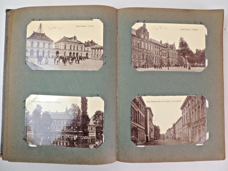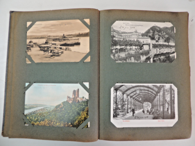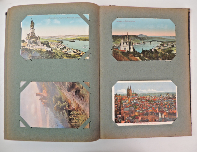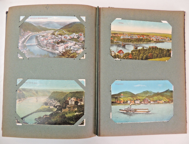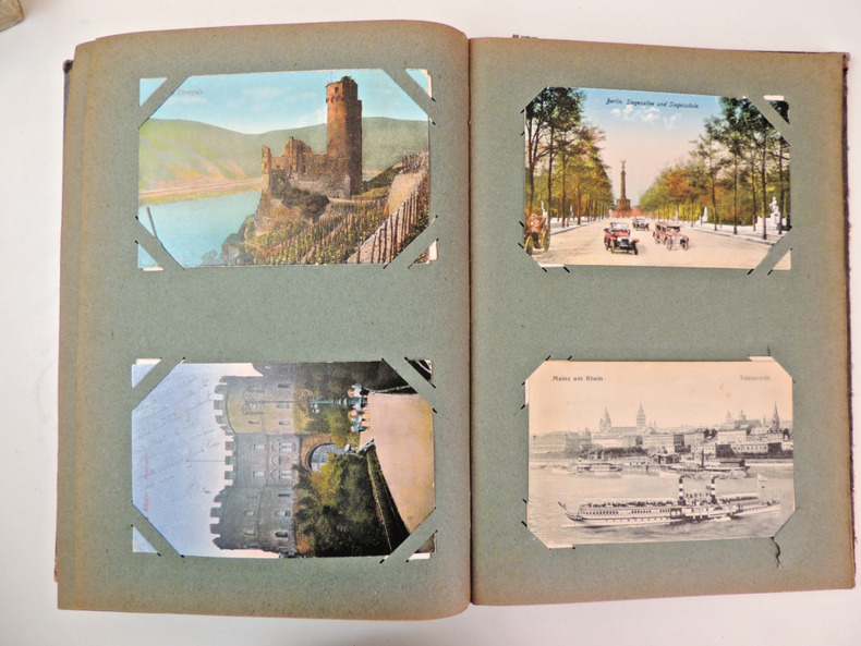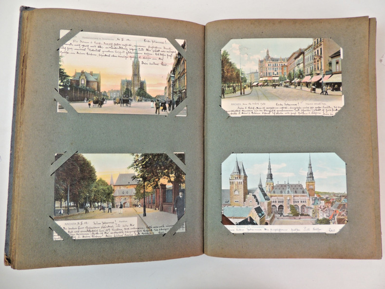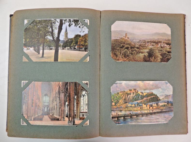 format 28x20cm, relié percaline illustrée, complet, bon état. 100 pages, soit 200 cartes postales, nombreuses en couleur avec indications des lieux et notes vers 1908/1910, quelques cartes plus contemporaines également On peu y voir; Cote d'émeraude, Baden-Baden, Dinant, Frankfurt, Belgique Exposition de Bruxelles 1910, Wisesbaden, Koln, Vallée de la Meuse, Aachen, Givet, Les ardennes, Cote d'Azur, etc..