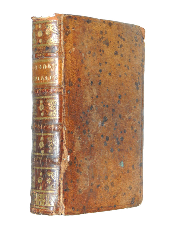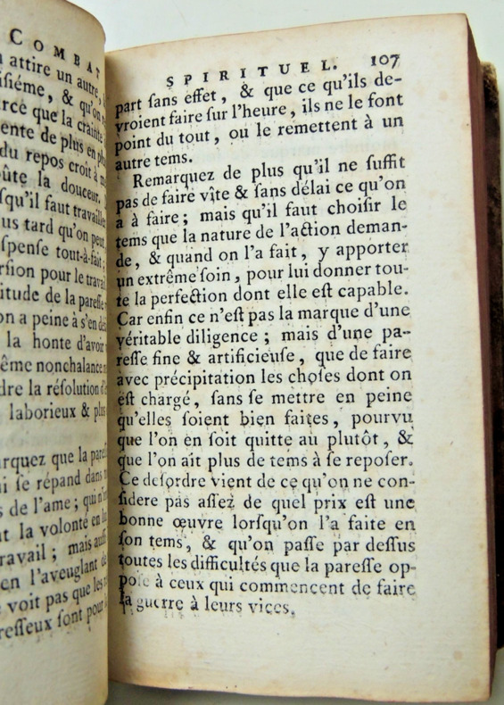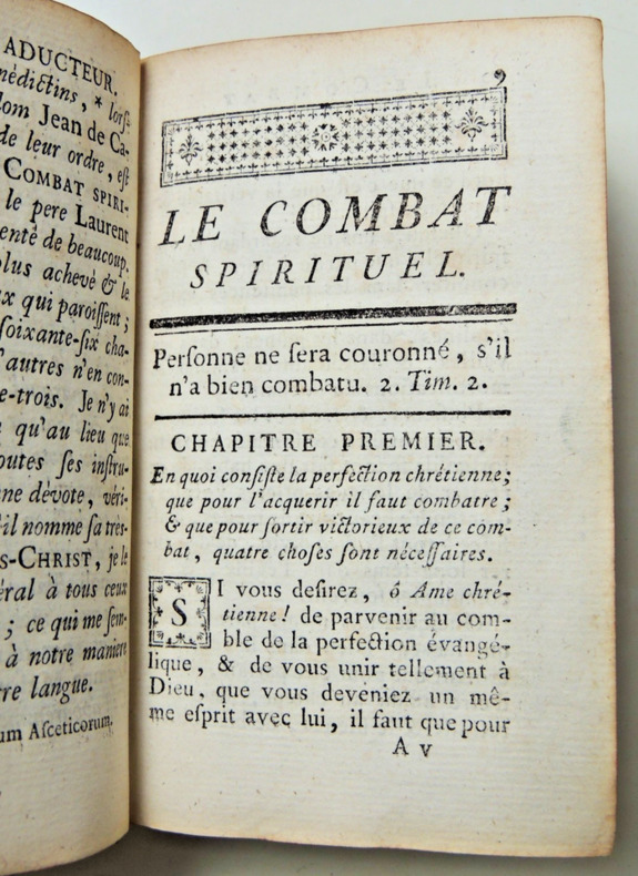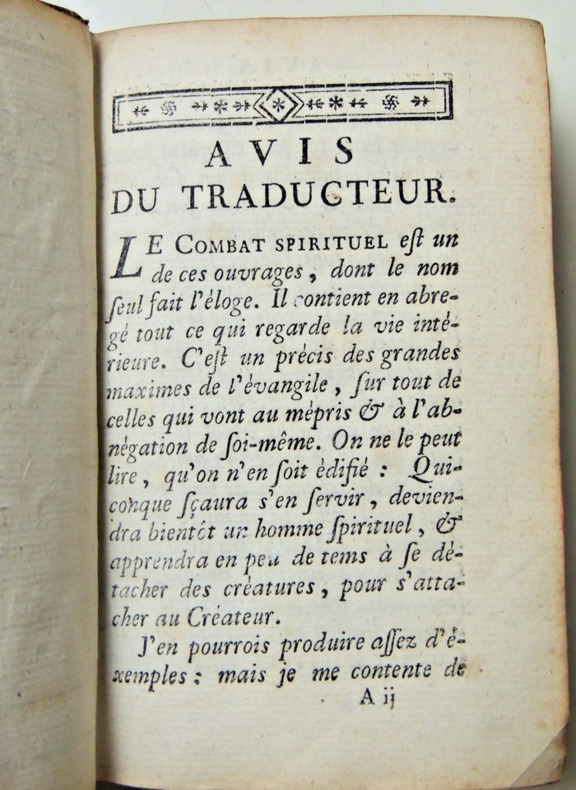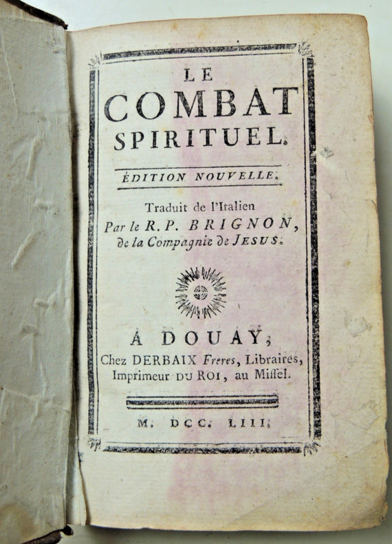 Le combat spirituel nouvellement traduit de l’Italien par P.J BRIGNON.Iin 32 plein cuir fauve raciné à nerfs,pièce de titre cuir vert,roulette,palmette dorés,roulette dorée sur coupes. Titre,VIII avertissement,354 pages,tranches rouges,5 pages de table des chapitres et approbation, Nancy Messin Prévost Leclerc 1721 très bon état. traduit de l'italien RPD Laurent SCUPOLI Le véritable auteur serait D. Jean de CASTANIFA; pour d'autres Achille GAGLIARDO jésuite.