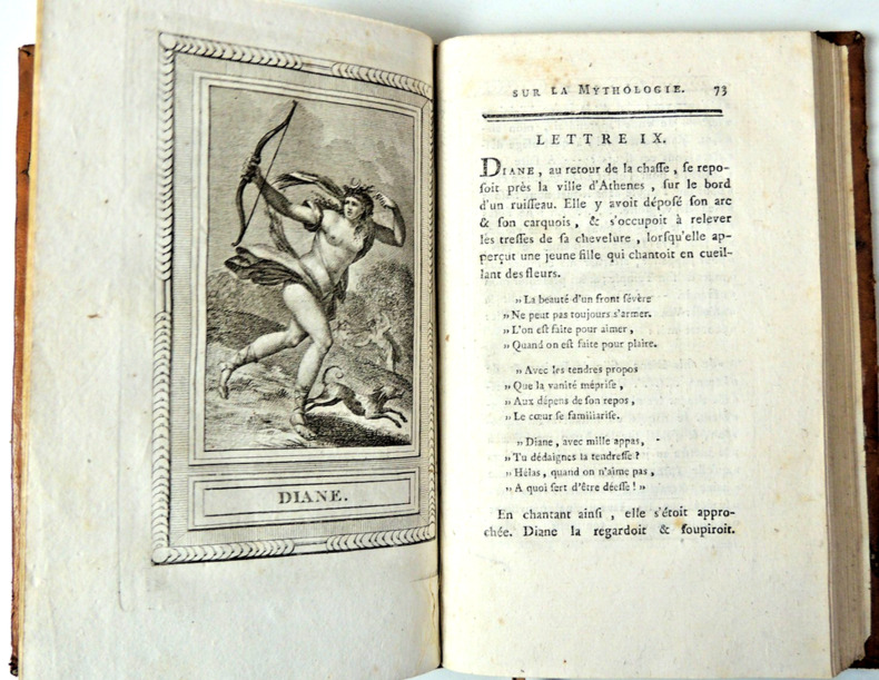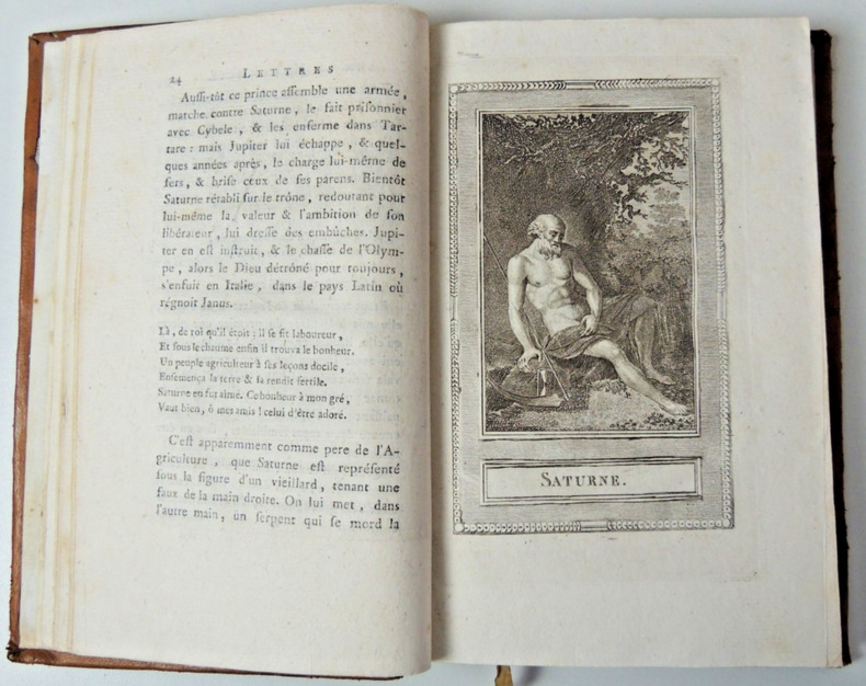 Nouvelle édition, Tome I, Première & seconde parties, Lettres I-XXIV 11 gravures en taille douce; Neptune, Saturne, Junon, Jupiter, Hébé, Iris, Pallas, Cérès, Pluton, Diane, Mercure. volume in 8, relié pleine basane époque, 20x14, leg. accrocs, bel état intérieur, 263pp. A Buckingham, 1795 ref/25