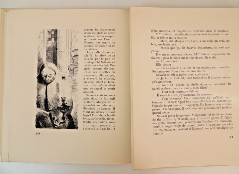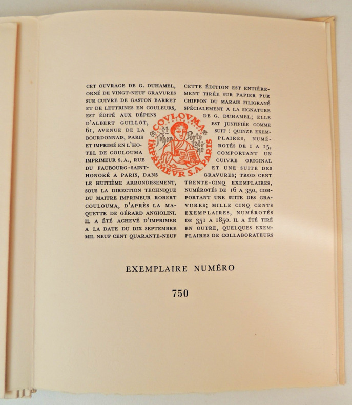 29 gravures sur cuivre de Gaston Barret, lettrines en couleur volume, page en feuillet, 210x180, sans emboitage, couverture crème, sur papier du Marais, Exemplaire numéroté. Très bel état. Albert Guillot 1949 ref/20
