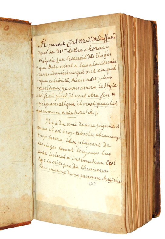 Edition originale collective, les cinq derniers volumes sur 6 paraissant ici pour la première fois. Les Eloges sont des biographies qui étaient lues aux séances de l'Académie. Elles regroupent tous les élus du XVIIIe au nombre de 100. Ces discours sont souvent annotés pour davantage de précisions. Il ne faut pas prendre le terme d'éloge au sens moderne, car il s'agit non seulement ici de biographies et d'études érudites d'une vie mais aussi de critique d'une œuvre et d'un personnage, et toutes ces vies fournissent des renseignements précieux. Jean Le Rond d'Alembert fut élu le 28 novembre 1754 à l'Académie française. Il en devint le secrétaire perpétuel le 9 avril 1772. « Les années 70 à 80 représentent la consolidation de la position de d’Alembert comme maître de l’Académie française et arbitre des questions littéraires. Sa tentative d'imposer à l'Académie des normes pour la poésie fut violemment rejetée par le public. Le but de tout écrit étant d'exprimer clairement des pensées, l'Académie jugera bon un poème lorsqu'il se rapprochera le plus de la prose, déclare-t-il dans ses Réflexions sur la poésie lues à l'Académie en 1760 et publiées en 1767. Fréron s'écrie contre « l'irruption des enfants d’Archimède dans le sanctuaire de la poésie. Elle expire frappée du fatal compas » ; et Diderot conclut : « Qu'il s'en tienne donc aux équations ; c'est son lot. » Par contre ses autres discours publics à l'Académie eurent un grand succès, et il utilisa ces occasions pour prêcher la tolérance et la philosophie. Ses « Eloges » lui acquirent la réputation de continuateur de Fontenelle, son prédécesseur dans le genre, Les Éloges lus dans les séances publiques de l'Académie française furent publiés en 1779, et on publia en 1785 une édition posthume de son Histoire des membres de l'Académie française morts depuis 1700, jusqu'en 1771 en trois volumes (vols. 4 à 6 en 1787). Pendant ses dernières années, d'Alembert remplaça de plus en plus l'aristocratie, qu'il avait toujours combattue, dans le rôle de mécène pour les jeunes littéraires qu'il aidait dans leur carrière. Le plus illustre de ses disciples fut Condorcet, dont il fit avec Watelet son exécuteur testamentaire. Il fut inhumé comme incrédule dans une fosse commune. John Pappas. Fort bel exemplaire relié en veau blond de l’époque, teinte recherchée.
