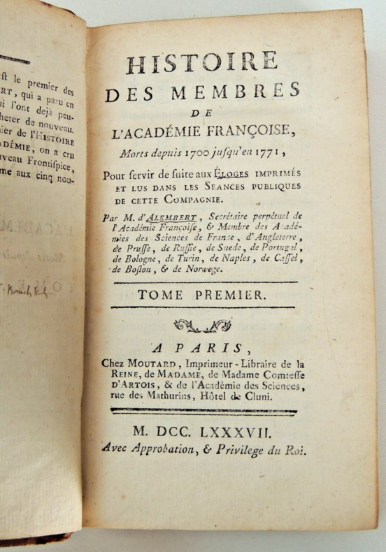 Edition originale. Seul le premier volume (Eloges) avait paru du vivant de D'Alembert. C'est Condorcet qui publia les cinq volumes de l'Histoire des membres de l'Académie d'après les papiers laissés par D'Alembert. Le tome II est de l'édition d'Amsterdam, et Paris, Moutard, 1787. Quérard I, 25.
