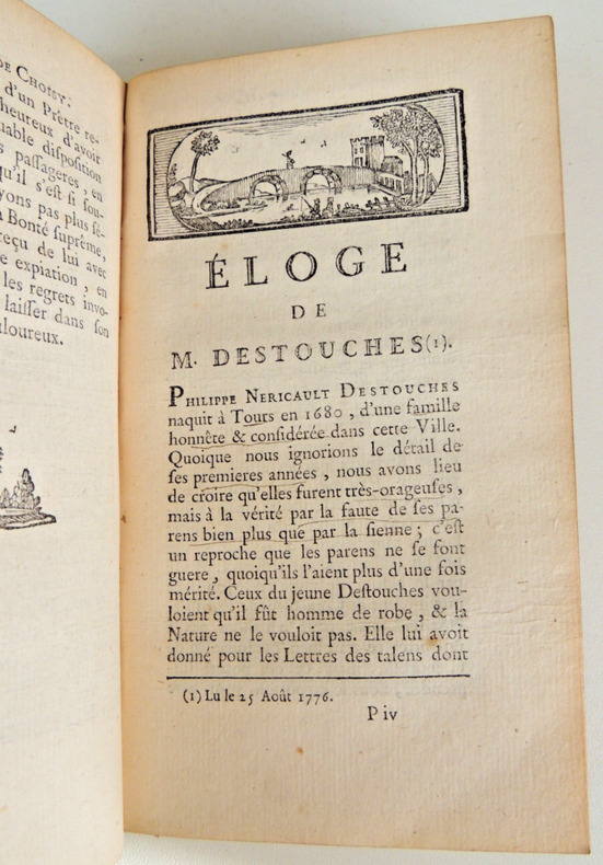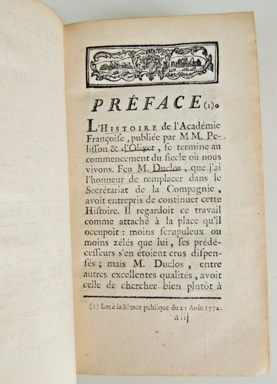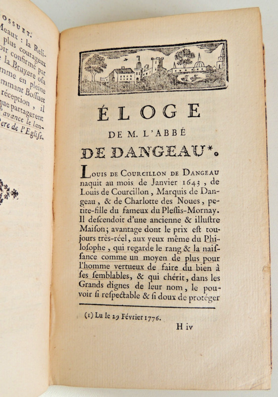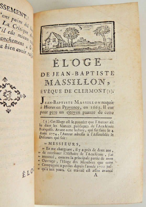 Tome I, qui comprend les éloges Massillon, Despréaux, Saint Pierre, Bossuet, Dangeau, flechier, Crébillon, Voltaire, Destouches, de Choisy, etc.. + deux avis sur les discours des prix L'édition complète comprend 6 volumes. L'exemplaire est ici, complet en lui-même, vol in12, reliure basane époque, 17x11, épidermures, manque à la coiffe, accrocs, frais, bon état intérieur, 555pp, page manuscrite époque contrecollée. Paris, Chez Moutard, 1787 ref/25