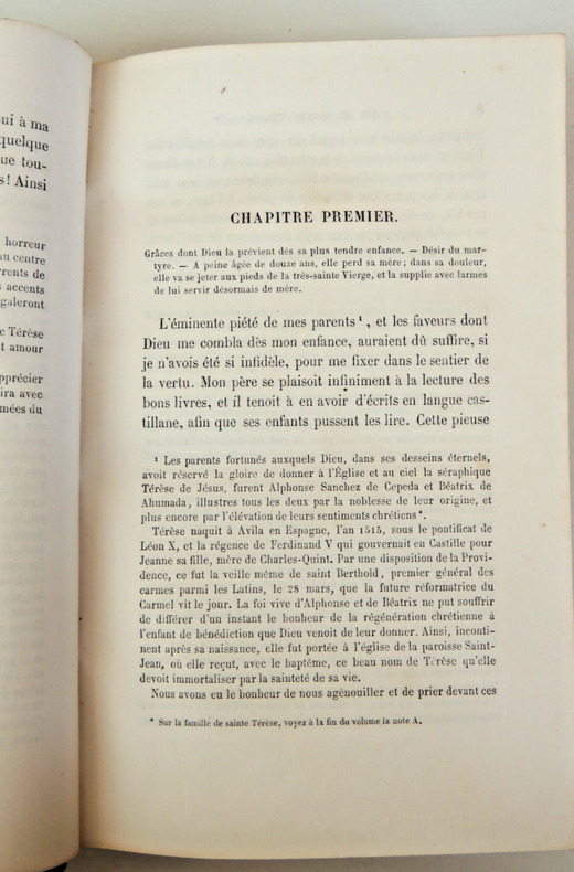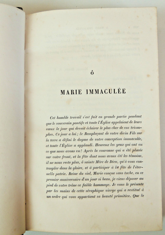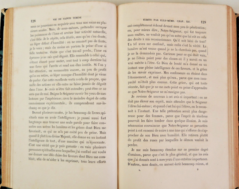 Tome I: (627pp )Vie de sainte Thérèse écrite par elle-même. Tome II: (596pp) Le Livre des fondations, Le livre des exclamations, Glose du Cantique de Sainte Thérèse, Avis de la sainte à ses religieuses. Tome III: (576pp) Le chemin de la perfection, Le château intérieur ou les demeures de l'âme. complet en trois vols reliés demi cuir, gd in8, 200x120, bel état intérieur, cachet du séminaire des missions, Montfort sur Meuse. Paris, Lecoffre et Cie, 1859 ref/117