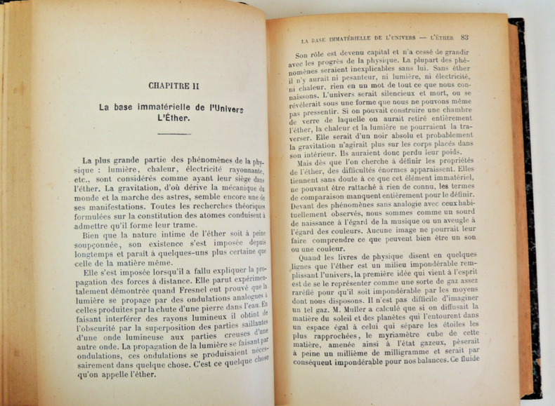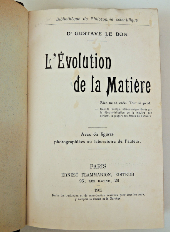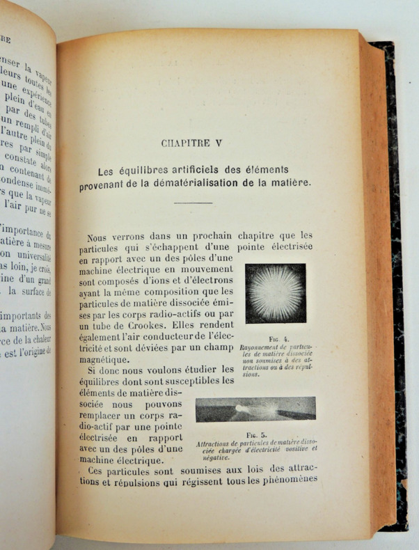 avec 62 figures photographiées au laboratoire de l'auteur. Table; les idées nouvelles sur la matière, l’énergie intra-atomique et les forces qui en dérivent, le monde de l'impondérable, la dématérialisation de la matière, le monde intermédiaire entre la matière et l'éther, le monde du pondérable, naissance, évolution et fin de matière, recherches expérimentales de l'auteur. vol relié demi cuir, 18x12cm, très bel état, 389pp. Edition Originale Paris, Flammarion, 1905. Bibliothèque de philosophie scientifique ref/117