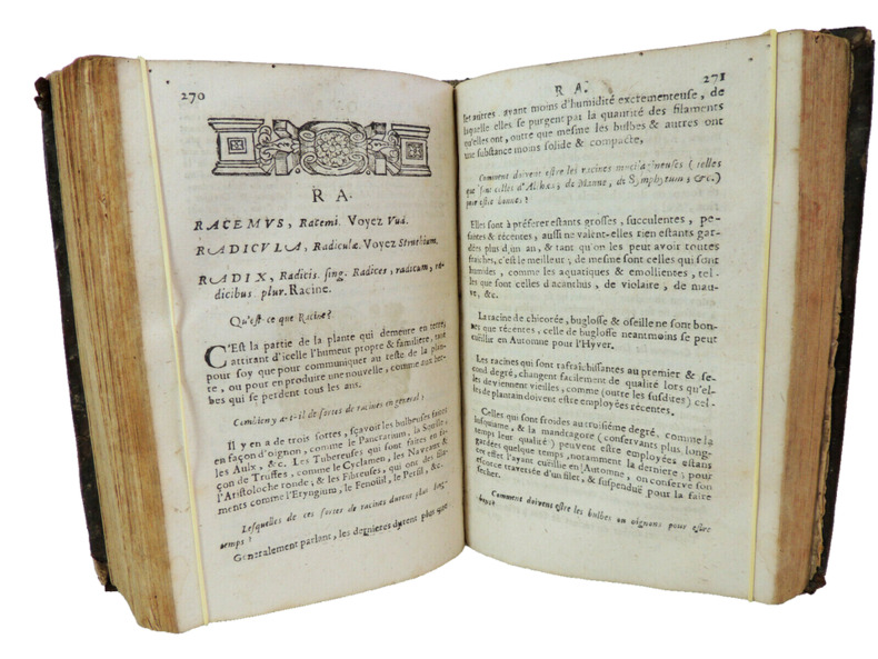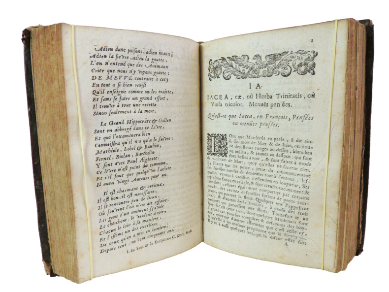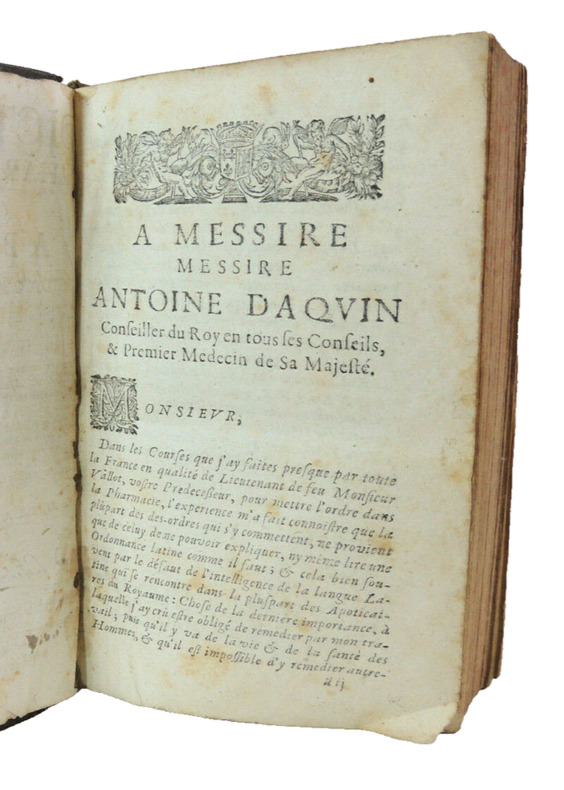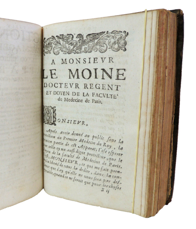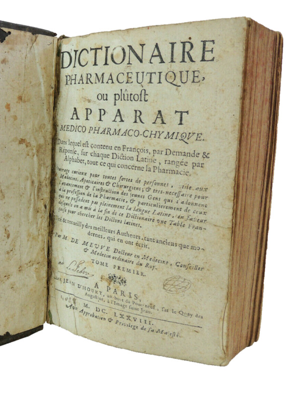 Travail considérable considéré comme la première encyclopédie pharmaceutique moderne en français, qui précède de peu le Traité universel des drogues de Lemery. L'édition originale est publiée en 1677 chez D'Houry, celle de 1678 est considérée comme un retirage de la première. Cet ouvrage qui se rapporte au domaine de la pharmacie, de la médecine et de la chimie, et qui vise à fournir une référence complète et détaillée pour les savants, ainsi que pour les chercheurs et les étudiants de cette époque. Il contient une compilation de termes, de définitions, de descriptions de médicaments, de substances chimiques et de concepts médicaux liés à la pharmacie, à la médecine et à la chimie. L'auteur, M. de Meuve, estait un docteur en médecine, ce qui suggère une solide expertise dans le domaine médical. Cette expérience et cette éducation médicale peuvent garantir une approche précise et fiable de la terminologie et des concepts médicaux, et des informations sur les médicaments, les préparations pharmaceutiques, les techniques de fabrication, les réactions chimiques, les substances chimiques, les remèdes médicaux, les diagnostics, et d'autres sujets liés à la médecine et à la pharmacie. Il contient des références à des personnalités historiques importantes de la médecine et de la pharmacie. En résumé, "Dictionaire Pharmaceutique ou plutôt apparat Medico Pharmaco-Chymique" de M. de Meuve est un ouvrage qui offre une compilation détaillée de termes et de concepts liés à la pharmacie, à la médecine et à la chimie. Il constitue une ressource précieuse pour quiconque souhaite approfondir ses connaissances dans ces domaines ou rechercher des informations spécifiques sur des médicaments, des substances chimiques ou des concepts médicaux. Complet deux tomes en un fort vol in8, 20x15, relié pleine basane époque, accrocs, et manque de cuir, manipulé, solide, bien frais, 576, 559 pages. Paris, chez Jean d'Houry, 1678. ref/dp