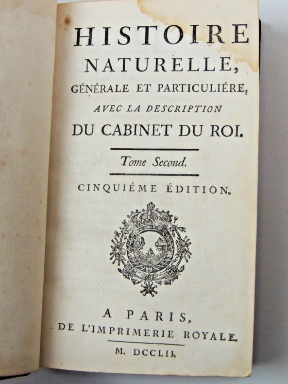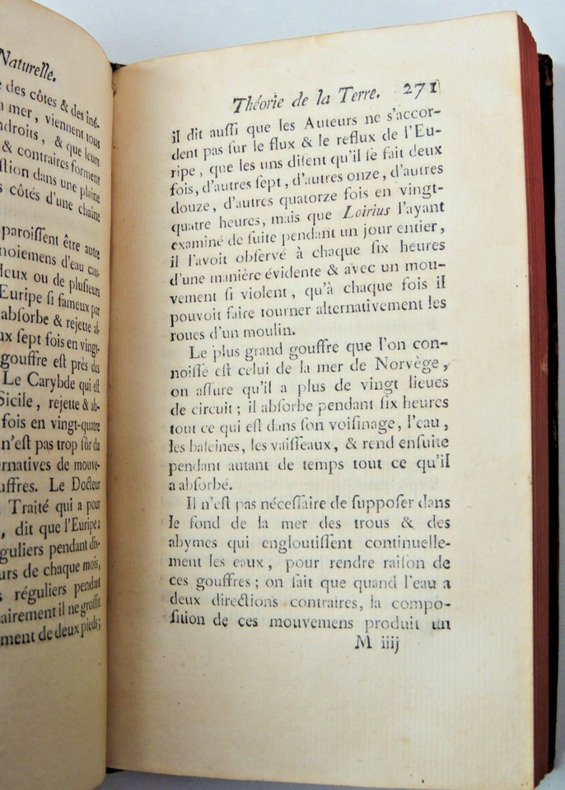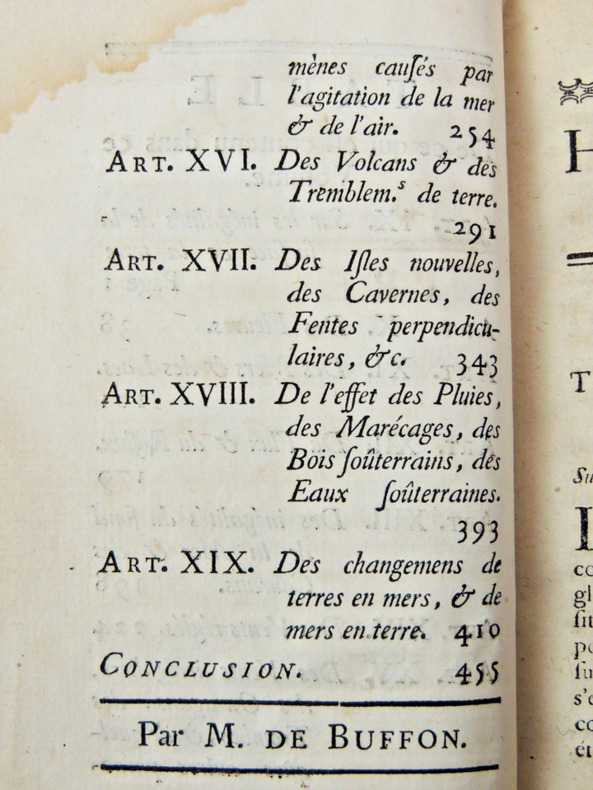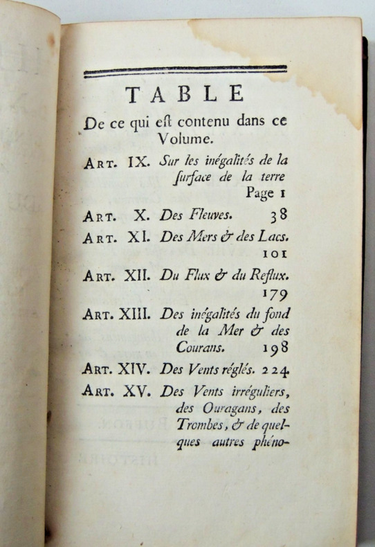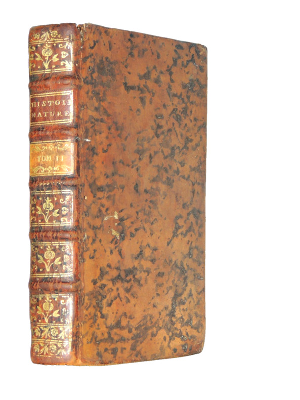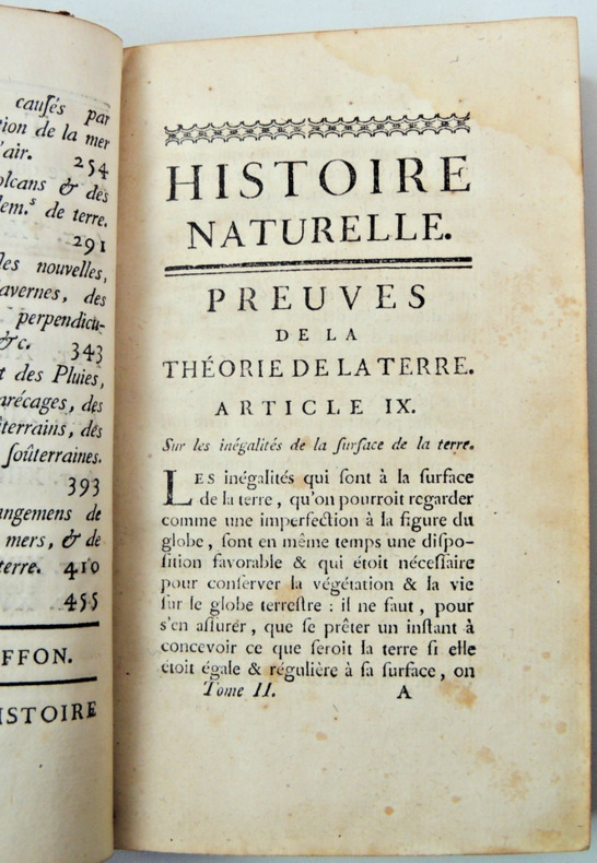 Tome II. Théorie de la Terre Table; sur les inégalités de la surface de la terre, des fleuves, des mers et des lacs, du flux et du reflux, des inégalités du fond de la mer et des courants, des vents irréguliers, des ouragans, des trombes et autres phénomènes causés par l'agitation de la mer et des airs, des volcans et des tremblements de terre, des iles nouvelles, des cavernes, des fentes perpendiculaires, de l'effet des pluies, des marécages, des bois souterrains et eaux souterraines, des changements de terre en mer et de mers en terre. vol in8, 18x10cm, relié pleine basane époque, accrocs, traces de mouillures anciennes en marge, bien frais, 458pp. Paris, Imprimerie Royale, 1752 ref/27/2