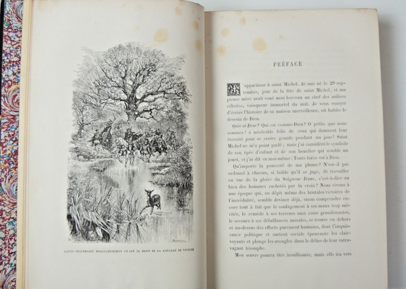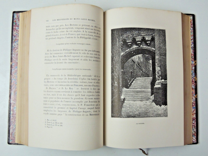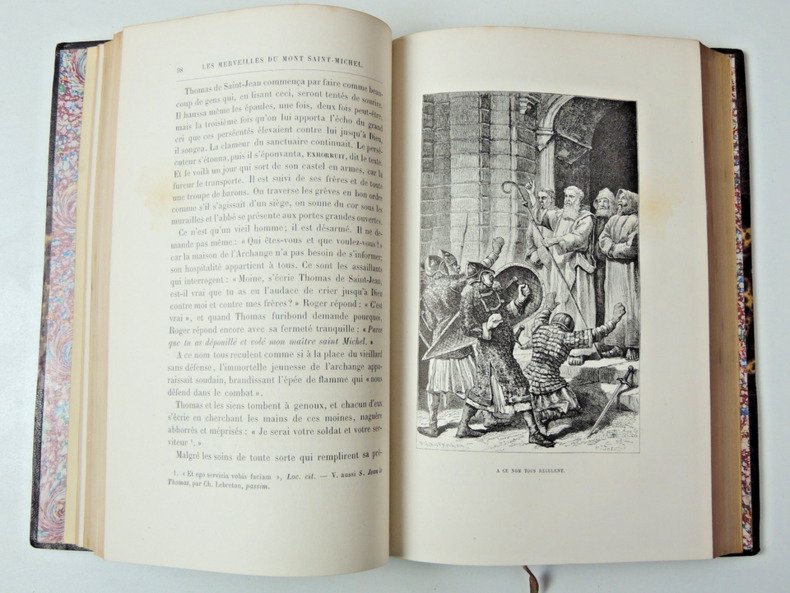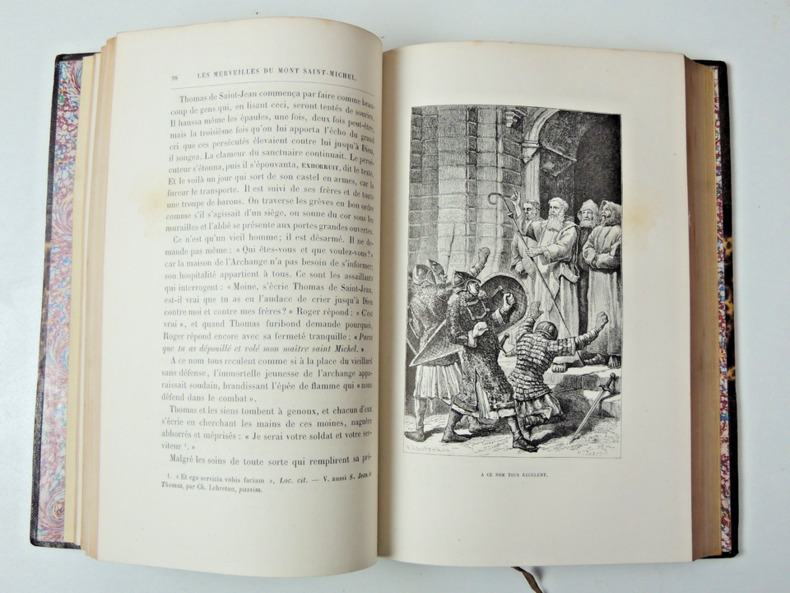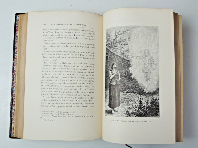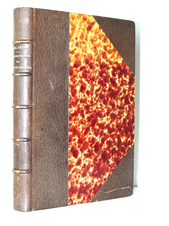 joli volume in-4, 245x165, relié demi cuir à coins, frottements, petite rayure, dos à nerfs, 356pages, toutes tranches dorées Table :Saint Michel, les anges, le combat dans le ciel. Le paradis terrestre. Mission de Michel, gardien de synagogue. Les mythologies. Le Christ. Mission de Michel, defénseur de l'Eglise. Le mont Gargan. Livre premier: L'Apparition et la Fondation. II: Les Moines. III: Les Sièges. Guide du touriste au Mont Saint-Michel Illustrations in et hors texte, très bel état intérieur, bel exemplaire Paris Victor Palmé, sans date vers 1860/1880