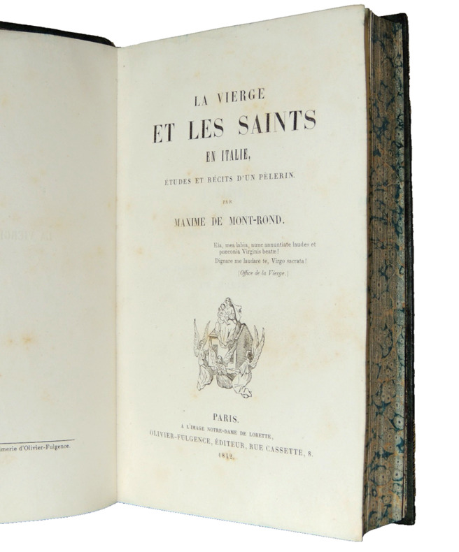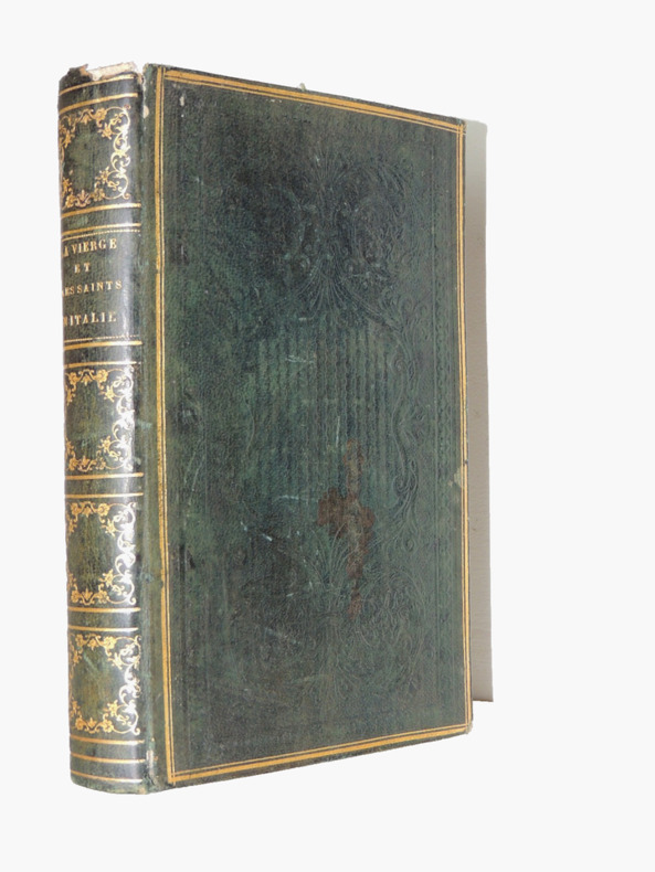 LA VIERGE ET LES SAINTS EN ITALIE / ÉTUDES & RÉCITS D'UN PÈLERIN Maxime de Mont-Rond extrait; Culte de la vierge à Rome - Un soir sur le mont Janicule - Venise - Gondolier à Murano - Fête de Saint Louis à Gonzague - Route de la corniche - Gene... vol relié plein cuir gaufré, 210x135, ( frottements et accrocs à la coiffe ), très bon état intérieur, toutes tranches jaspées, 521pp Paris, Olivier Fulgence 1842