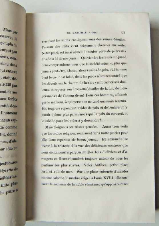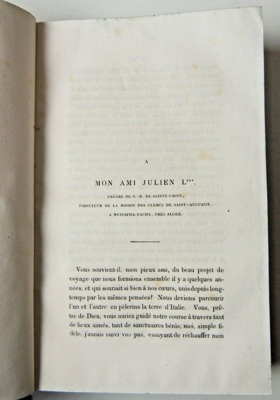 extrait; Culte de la vierge à Rome - Un soir sur le mont Janicule - Venise - Gondolier à Murano - Fête de Saint Louis à Gonzague - Route de la corniche - Gene... vol relié plein cuir gaufré, 210x135, ( frottements et accrocs à la coiffe ), très bon état intérieur, toutes tranches jaspées, 521pp Paris, Olivier Fulgence 1842. Edition Originale ref/5