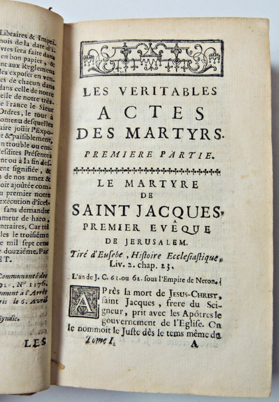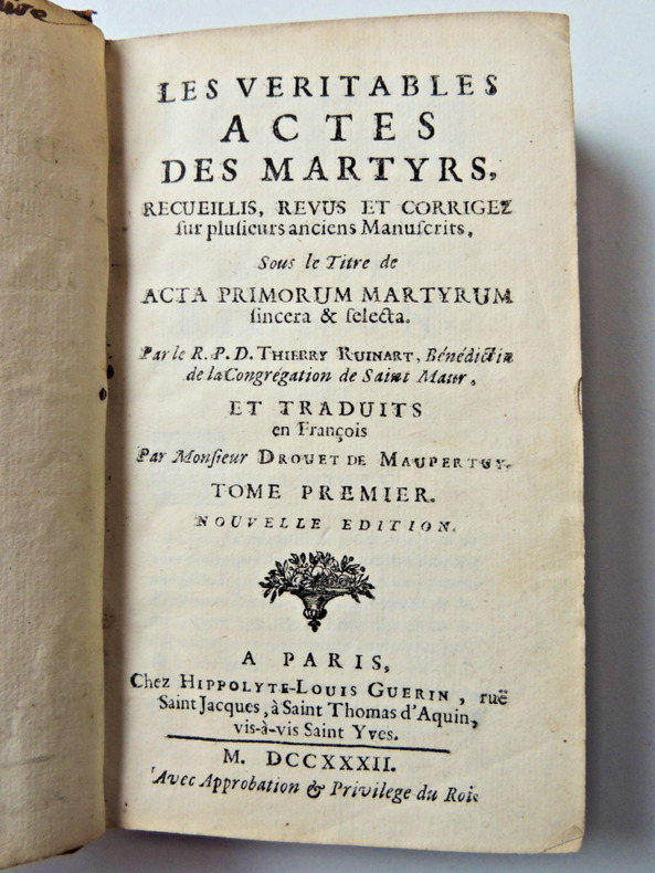 Par le Révérend Père Thierry Ruinart, et traduit en Français par M. Drouet de Mauperthuy Tome I, ( sur deux) nouvelle édition, L'exemplaire est ici, complet en lui-même, vol in12, reliure basane époque, 17x11, accrocs, frais, bon état intérieur, 650pp, ex dons manuscrit de l'ancien propriétaire ' Mignot, Église d'Auxerre. ' Paris, Chez Hippolyte Louis Guerin, 1732 ref/25