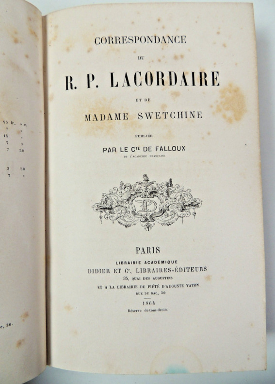 Publiée par le comte de Falloux, neuvième édition, Librairie académique Didier et Cie, Libraires-éditeurs Paris 1880. Reliure demi-cuir rouge.