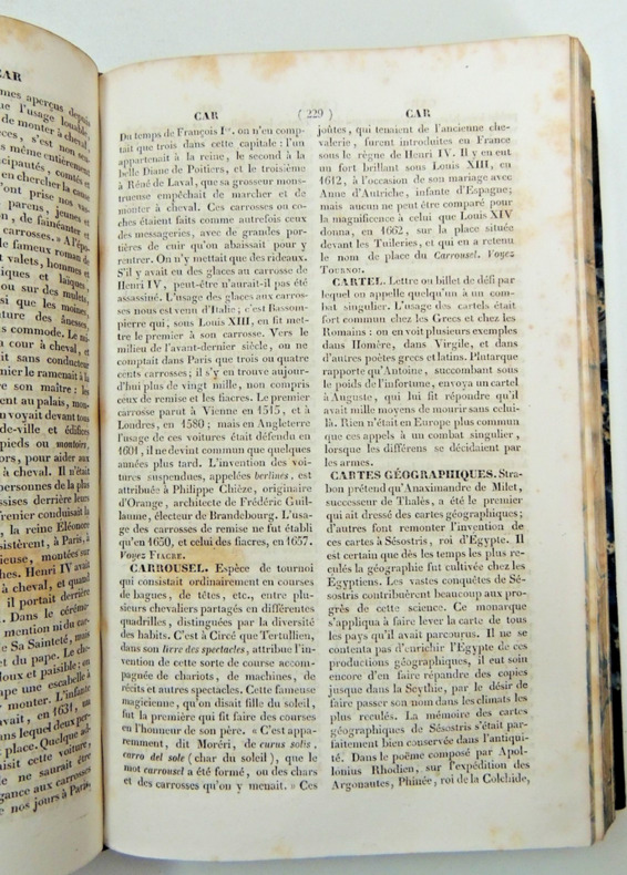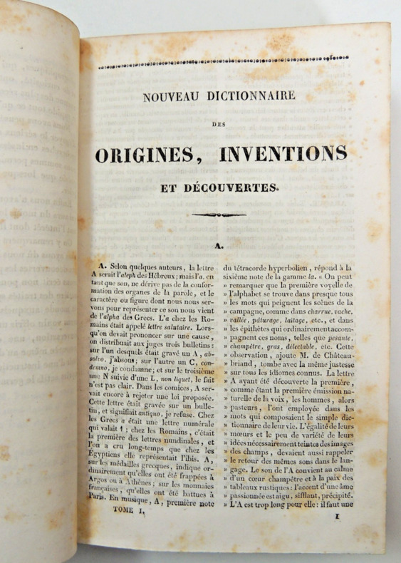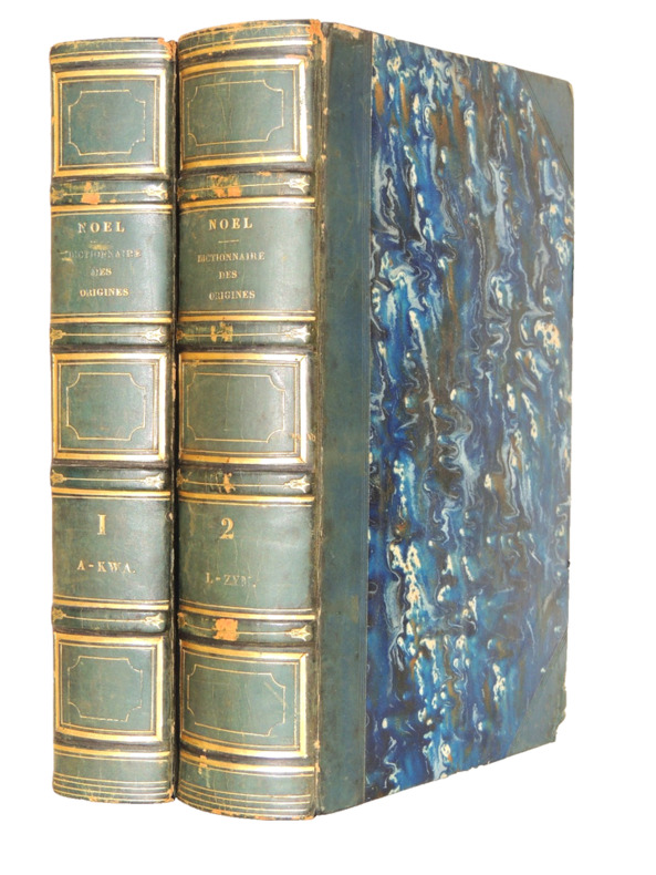 Noël (Fr.) et Carpentier (M.)Nouveau dictionnaire des origines, inventions et découvertes dans les arts, les sciences, la géographie, le commerce, l'agriculture, etc., indiquant les époques de l'établissement des peuples, des religions, des sectes et institutions religieuses, des lois, des dignités - l'origine des différentes coutumes, des modes, des monnaies, etc., ainsi que les époques des inventions utiles, et des découvertes importantes faites jusqu'à ce jourJanet et Cotelle, 1827. 2 vol. in-8 de VI-689 et 871 pp., impression sur 2 colonnes, belle reliure plein cuir, tranches marbrées.Ravissant exemplaire