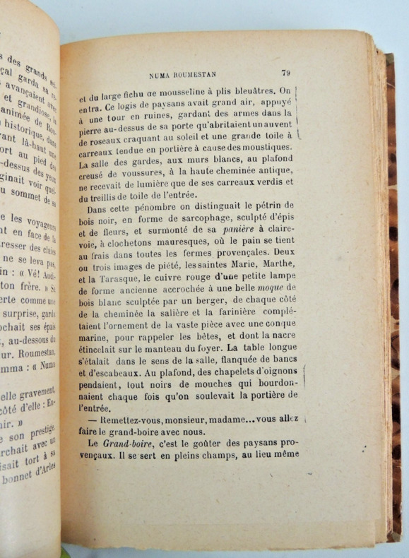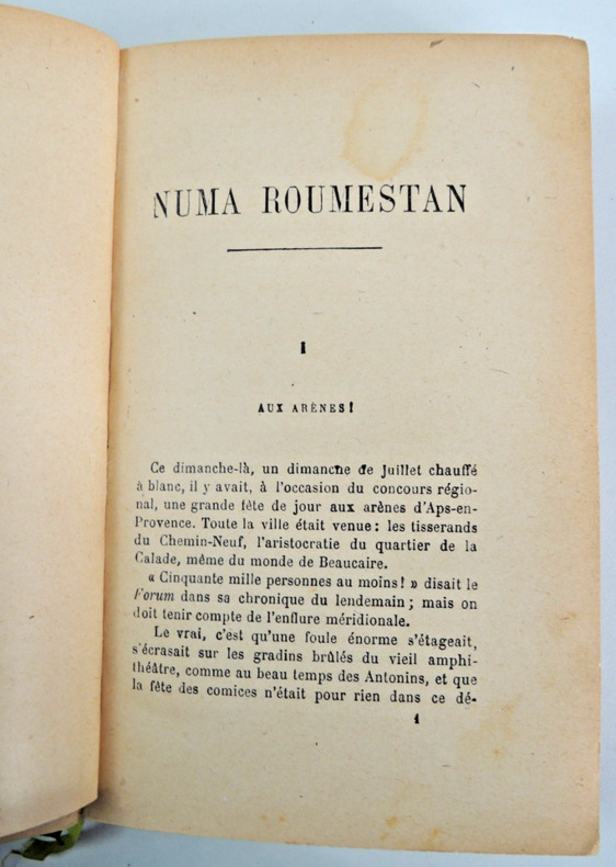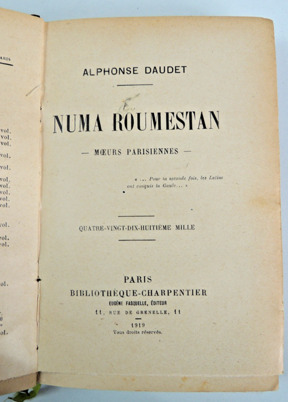 Roman antiméridionaliste d'Alphonse Daudet publié en 1881, mettant en scène un personnage du nom de Numa Roumestan. Il a été porté en pièce de théâtre en 1887 à l'Odéon de Paris volume, in8, 18x11, demi cuir, traces de mouillures anciennes, bon état, 345pp + catalogue éditeur Paris, Charpentier, 1881. Édition Originale. ref/247