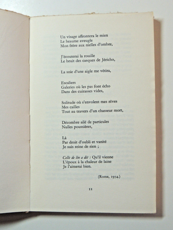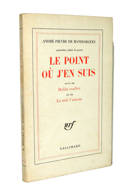 Paris : Gallimard, 1964. Un volume broché (11,8x18,5 cm), 110 pages. Un portrait photographique en frontispice. Édition originale : un des 3500 exemplaires sur vélin bouffant avec un envoi autographe signé d’André Pieyre de Mandiarges. Bon état.