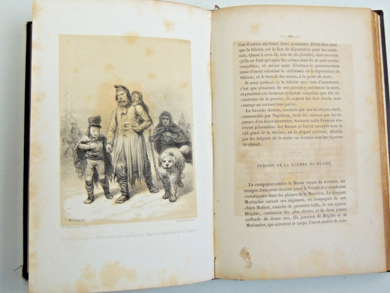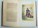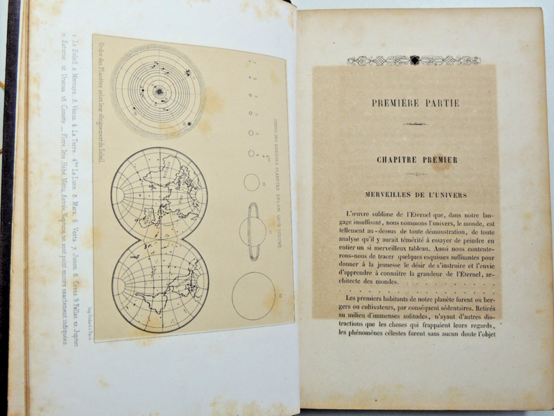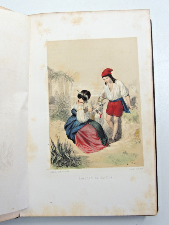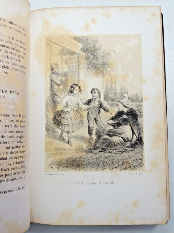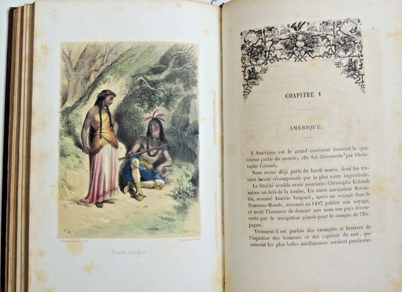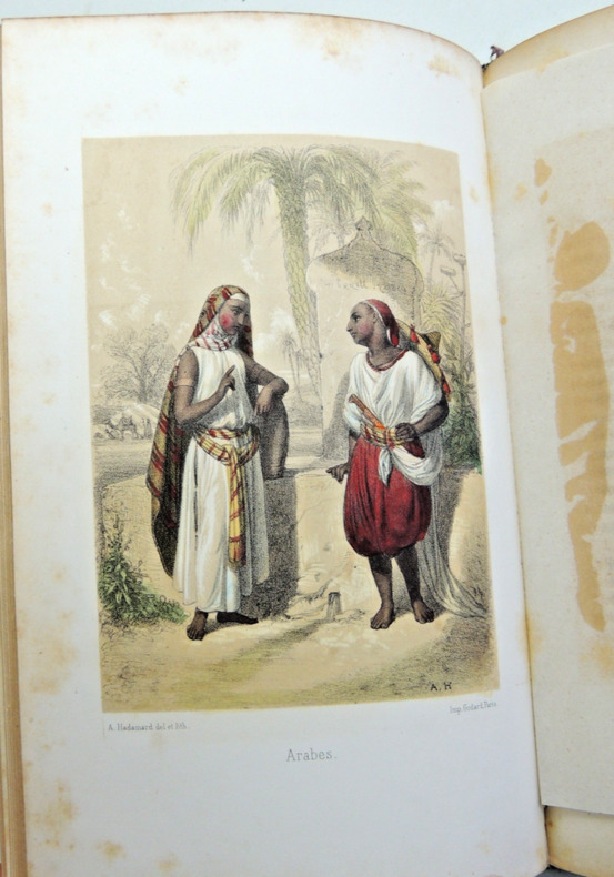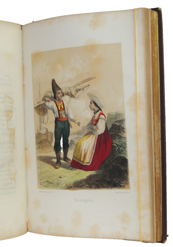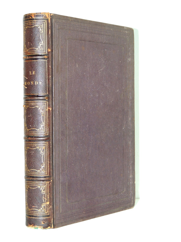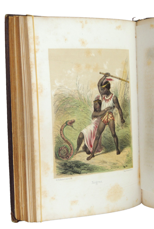 illustrée de 12 lithographies teintées et/ou coloriées (dont 11 représentant des types ethniques ou nationaux, par Hadamard). Table ( extraits); merveilles de l'univers, l'Europe, Asie, Afrique, Amérique, Chili, Océanie fort vol in-4, 240x160, relié demi cuir, dos à nerfs, tranche de tête dorée, petit manque en pied de coiffe, qq rousseurs, bon état intérieur, 301pp. Bel ouvrage, peu courant. Paris Amable Rigauld 1854 ref/20