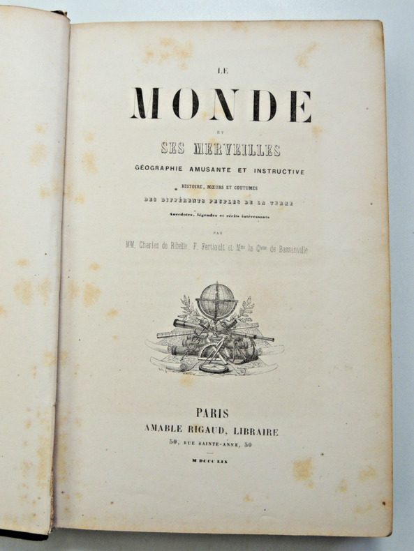 Oeuvre collective publiée en 1859 sous la direction d'Amable Rigaud, qui rassemble les contributions de plusieurs auteurs, dont Charles de Ribelle, F. Fertiault et la Comtesse de Bassanville. Ce livre, typique de son époque, vise à offrir une vision à la fois éducative et divertissante de la géographie, tout en explorant les cultures et les mœurs des peuples du monde.Exploration des mœurs et coutumes : L’un des aspects les plus intéressants de cet ouvrage est son attention portée aux traditions, croyances et modes de vie des différents peuples. Cette approche ethnographique, bien que teintée des préjugés du XIXe siècle, reflète la fascination de l’époque pour la diversité culturelle.