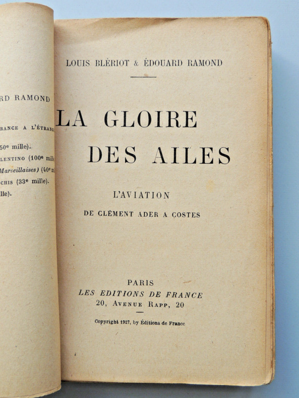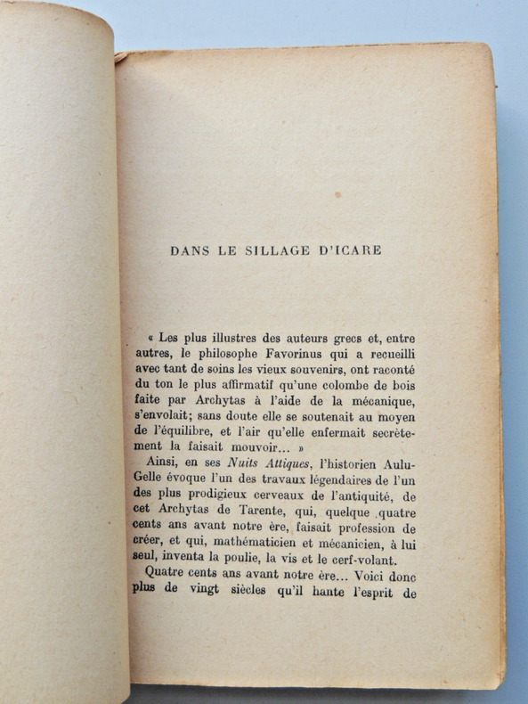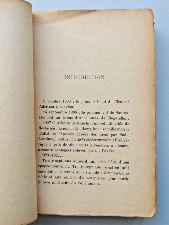 Table; Le rêve millénaire, L'aviation trébuchante, L'aviation triomphante, L'aviation et la guerre, L'aviation d'après guerre, Au-dessus des océans broché, 19x12, usures d'usages, bon état général, bel exemplaire, 335pp Paris, Les éditions de France, 1927 ref/20