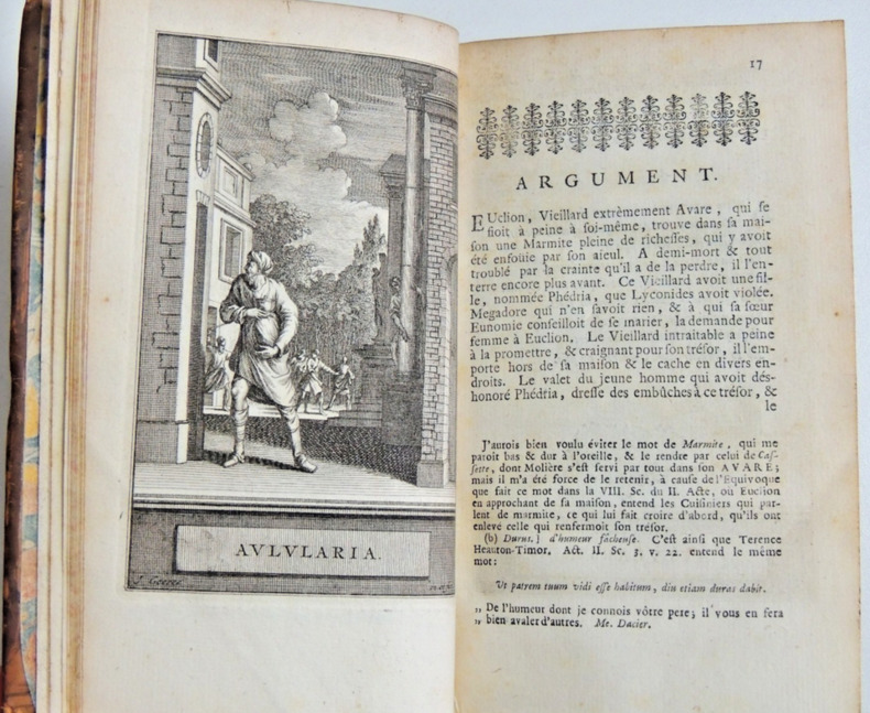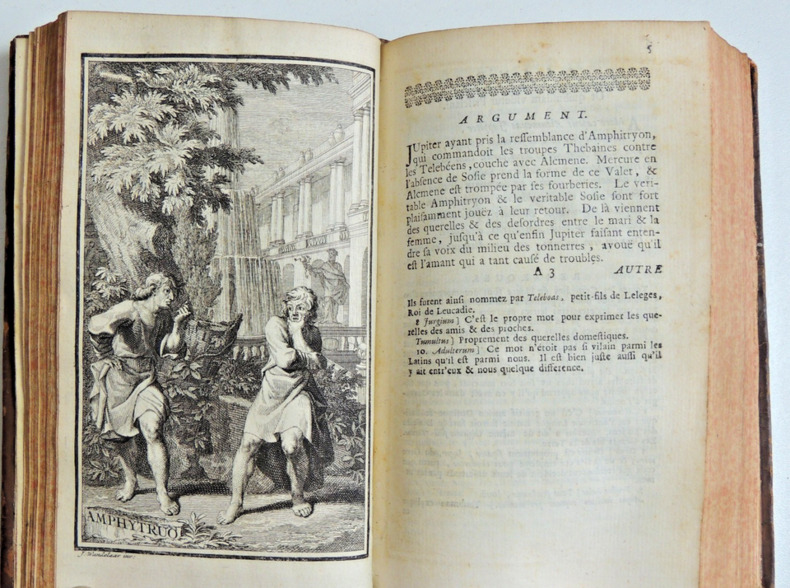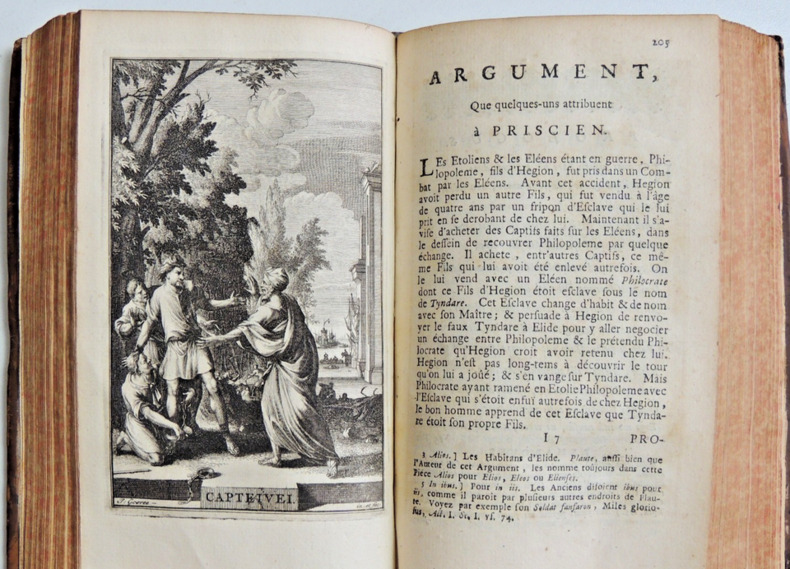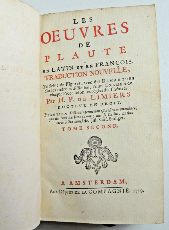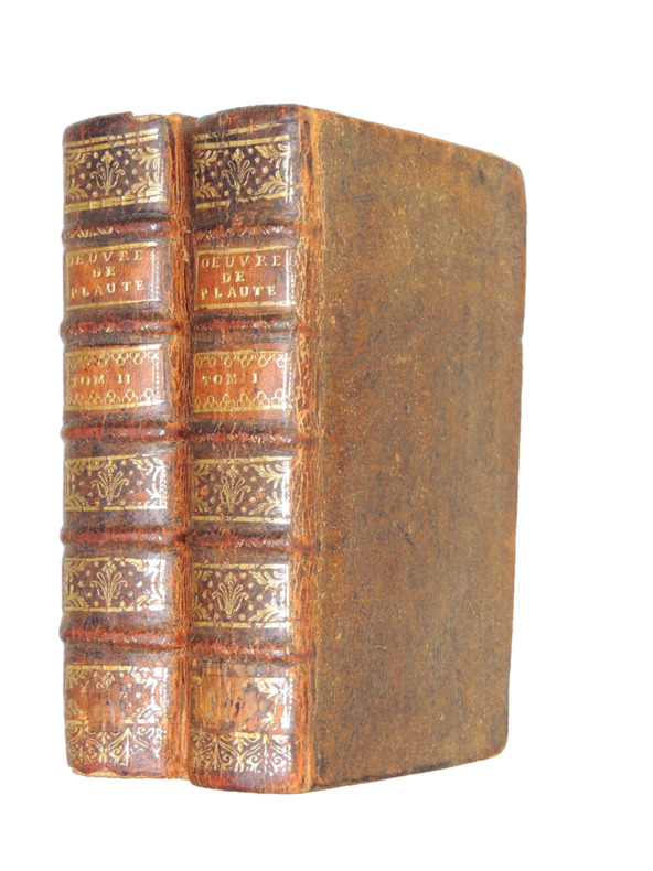 Traduction Nouvelle, enrichie de figures, avec des remarques sur les endroits difficiles, & un examen de chaque Pièce selon les règles du Théâtre; Par H. P. De Limiers Docteur en droit. Tome I. 451pp. La vie et les oeuvres de Plaute, l'Amphitryon par Madame Dacier, Lacinaire. Une gravure en frontispice + l'Amphytrion et Asinaria Tome II. 563pp. L'Avare, les captifs par Mr Coste, Le Curculion ou la reconoissance. Deux gravures; Capteivei et Cyrculio 2 Vols in8, reliures basane époque, accrocs, 16x10cm, bien frais, tranches rouges, beaux exemplaires. à Amsterdam, Aux dépens de la Compagnie, 1719 ref/145
