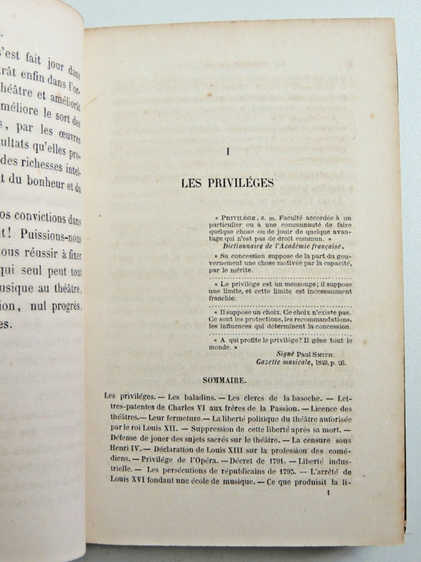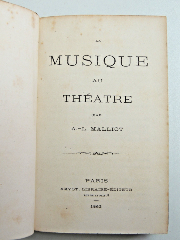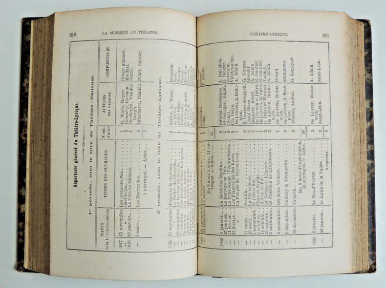 Table; les privilèges - L'Académie Impériale de musique 1570-862 - L'Opéra comique 1285-1862 - Anciens théâtres lyriques; le Gymnase, l'Odéon, Les Nouveautés, La Renaissance - Théâtre Lyrique -Les Bouffes Parisiens, Théâtre Offenbach - De L’impôt des pauvres sur les spectacles - Les compositeurs 1788-1862 - La décentralisation lyrique - Les acteurs - Réformes. Vol relié demi cuir, accrocs, 180x130, bon état int. 432pp, rare Paris Amyot, Libraire 1863 ref/185