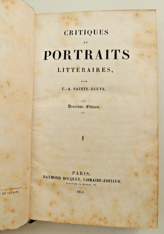 1 vol. in-8 reliure de l'époque pleine basane bleue, fers de prix du Lycée de Bordeaux au premier plat, tranches marbrées, Raymond Bocquet, Paris, 1841, 1 f., IV-559 pp. : Critiques et Portraits littéraires. Boileau, Madame de Sévigné, P.Corneille, La Fontaine, Racine, J. B. Rousseau, Lebrun, Mathurin Régnier, André Chénier, V. Hugo, Diderot, l'Abbé Prévost, Obermann, Lamennais