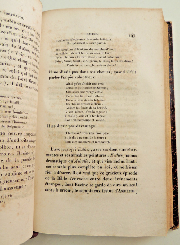 Boileau, Madame de Sévigné, P. Corneille, La Fontaine, Racine, J.-B. Rousseau, Le Brun, M. Régnier et A. Chénier. George Farcy, Victor Hugo, Diderot, L'abbé Prévost, Oberman, L'abbé de La Mennais., Lamartine, Béranger, Madame de Souza, M. Ballanche, M. de Balzac, Mirabeau, Molière, Madame Tastu, Madame de Staël, Madame Roland, M. de Vigny, M. Jouffroy, Madame Guizot, La Bruyere, Madame de La Fayette, Bernardin de Saint-Pierre, M. Nisard, Madame de Pontivy, Millevoye, Madame de Krüdner, Delille, M. Vinet, La Fayette, M. de Fontanes, M. Joubert. etc. complet en 5 volumes in-8, 200x180, reliés demi cuir, rousseurs, 574, 493, 573, 489, 553 pages. Paris, Raymond Bocquet, Libraire-éditeur 1841