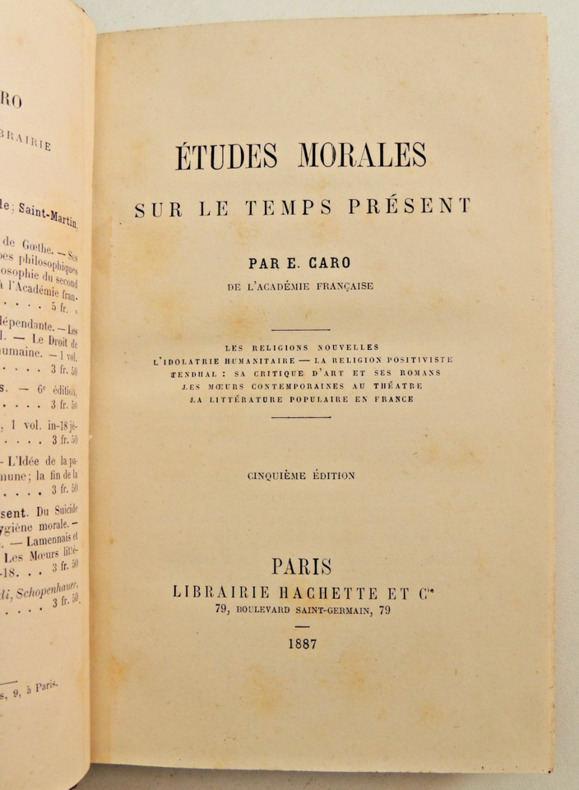 Les religions nouvelles - L'idolâtrie humanitaire - La religion positiviste - Stendhal : sa critique d'art et ses romans - Les mœurs contemporaines au théâtre - La littérature populaire en France vol in8, 180x140, relié demi cuir, bel état int. 398pp, bel ex. peu courant Paris Hachette 1887 ref/185
