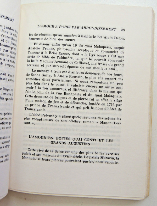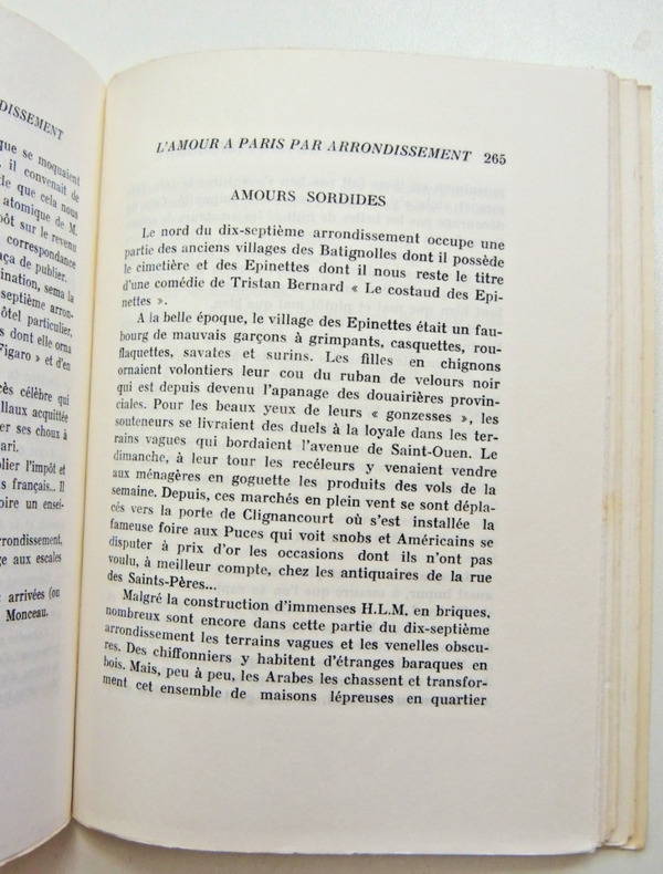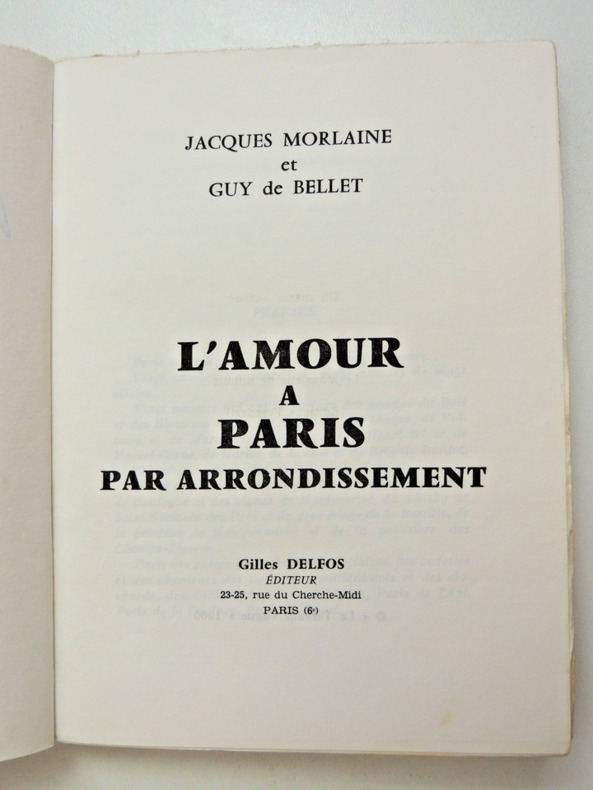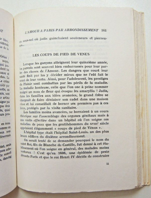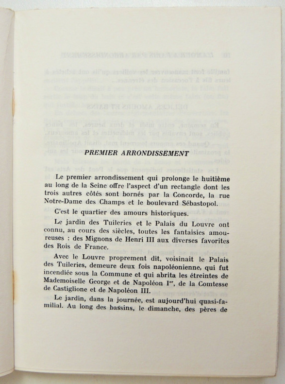 Guide documentaire publié en 1966 qui explore la vie amoureuse et les lieux de rencontre à Paris organisé selon une division par arrondissements." Paris a vingt arrondissements et vingt amours... vingt amours d'aujourd'hui, vingt amours de vingt siècles...Vingt amours qui ont le parfum des acacias du Bois et des Blousons noirs, des Salons et des bouges, de Voltaire et de Marie-Louise de Noailles, d'Henri III et de Marcel Carné, de Marion de Lorme et de Brigitte Bardot.... etc. " Un parcours à travers les époques.