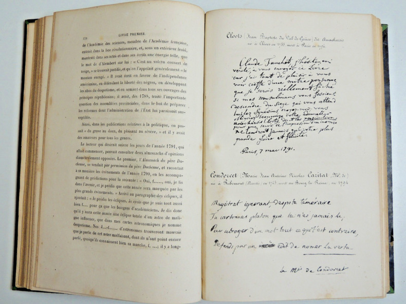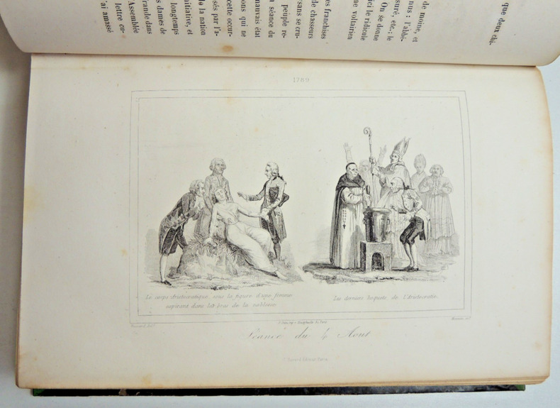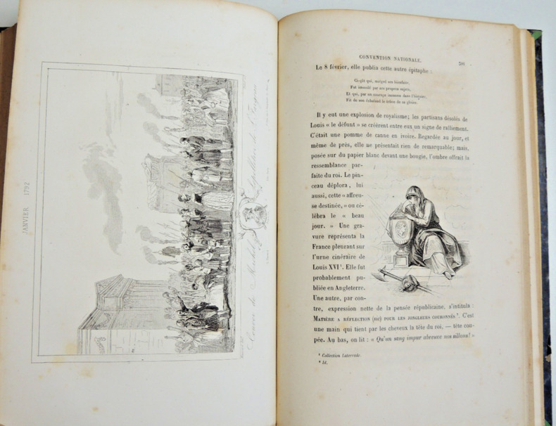 avec les estampes, costumes, médailles, caricatures, portraits et autographes les plus remarquables du temps. Tome I : 566pp. Assemblée Nationale constituante, Assemblée Nationale législative, Convention Nationale avec 78 gravures ou autographes hors texte, vignettes dans le texte Tome II : 550pp. Convention Nationale, Directoire exécutif, Consulat avec 72 gravures hors texte, vignettes dans le texte complet en deux forts vols in4, 270x180, reliés demi cuir, qq rousseurs, bien frais. Paris . A Ballay, Libraire, 1842