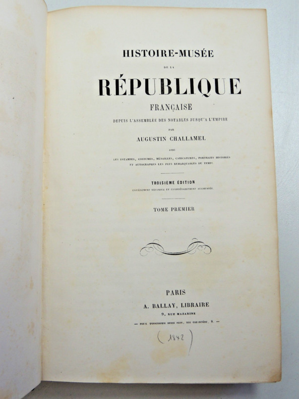 L'une des meilleures iconographies de la Révolution française. Conservateur de la bibliothèque Sainte-Geneviève, l'historien Jean Baptiste Augustin Challamel (1818-1892) publia de nombreux ouvrages de vulgarisation, qui rencontrèrent un grand succès. La valeur de ses ouvrages était renforcée par de nombreuses illustrations, comme son “Histoire-musée de la République française”, de 1789 à 1804, dont l'intérêt demeure grâce à sa très riche iconographie.