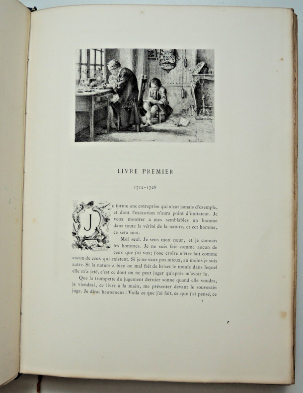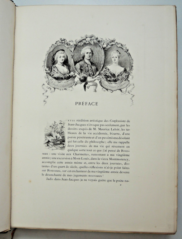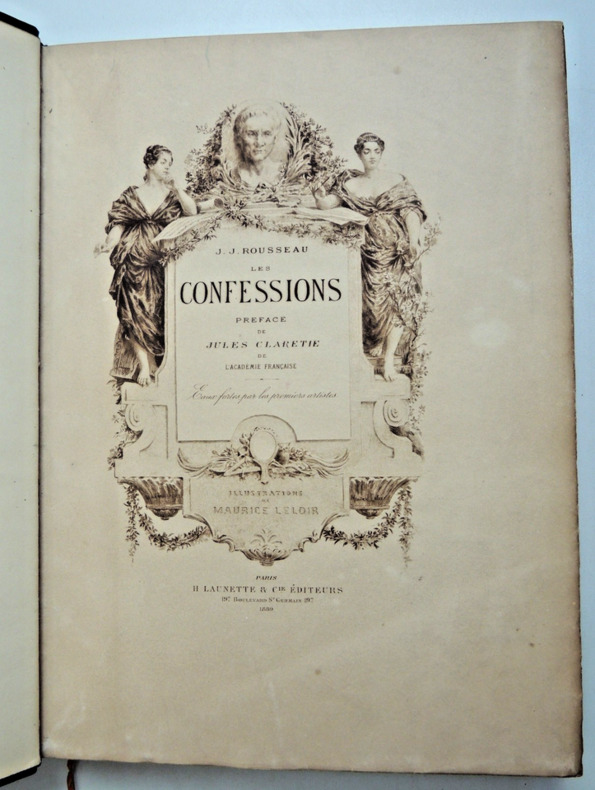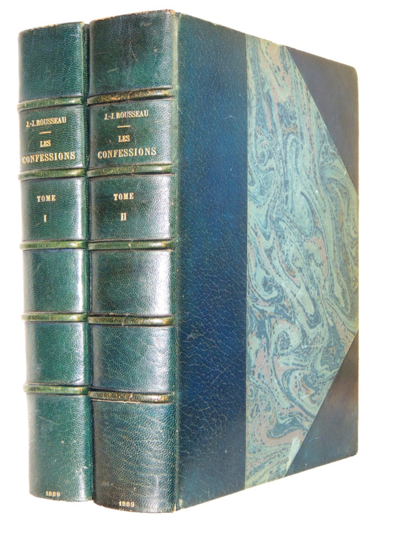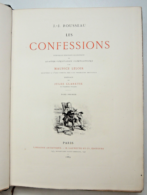 Nouvelle édition illustrée de 96 compositions par Maurice Leloir gravées à l'eau-forte par les premiers artistes dont 62 en hors texte. Préface de Jules Clarétie Les Confessions de Jean-Jacques Rousseau (1712 - 1778) est une autobiographie couvrant les cinquante-trois premières années de la vie de Rousseau. Complet en deux volumes In-Folio 330x230, reliés demi cuir à coins, frottements aux coins, tranches de têtes dorées, très bel état intérieur, 273, 382pp. Poids environ 7kg. Paris, Librairie Launette, 1889