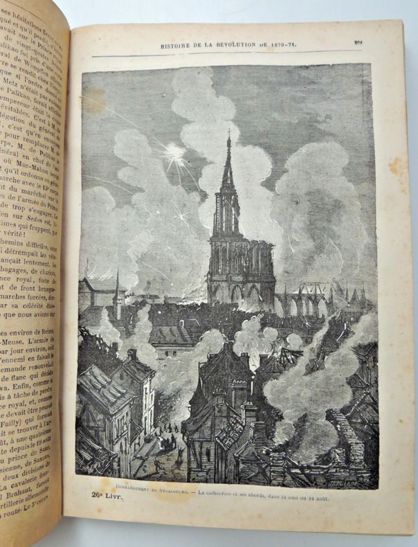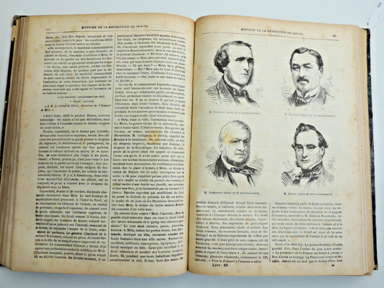 La proclamation de la République française du 4 septembre 1870 est la proclamation au peuple français par laquelle la République est rétablie, fondant ainsi la Troisième République et provoquant la déchéance de l'empereur Napoléon III et la chute du Second Empire. Nombreuses gravures en noir et blanc dans le texte et hors texte. complet en 2 vols reliés, 280x190, bon état général, un coin cassé au tome II, 880pp, 790pp sans date, vers 1880