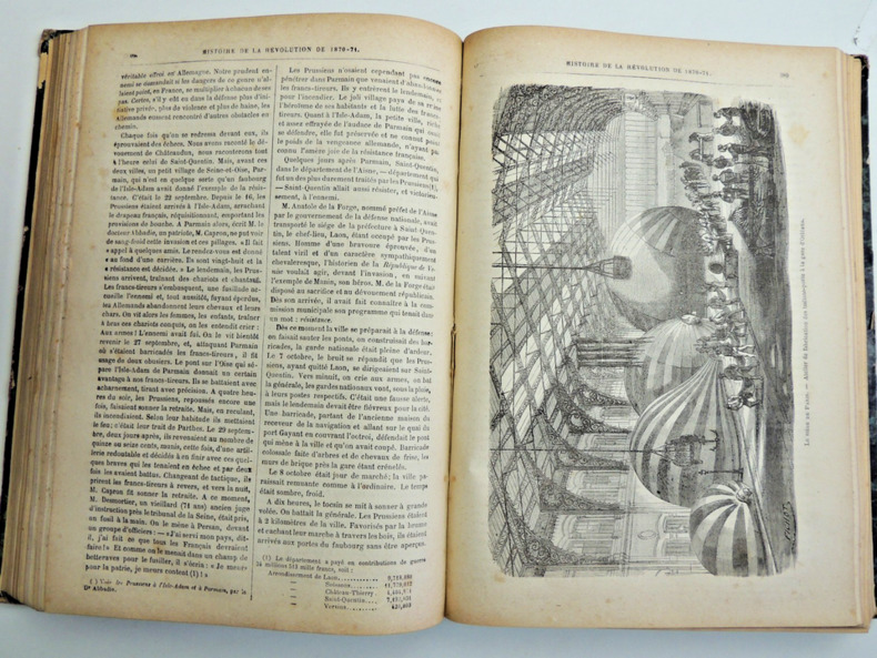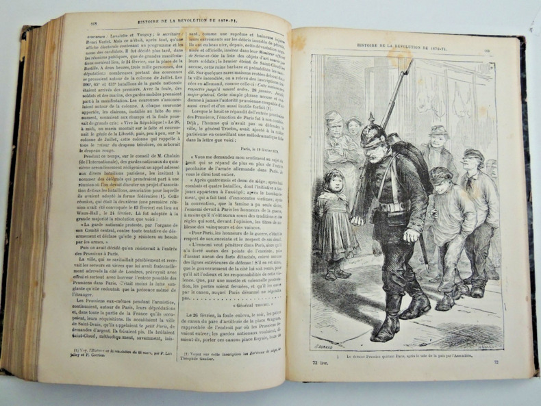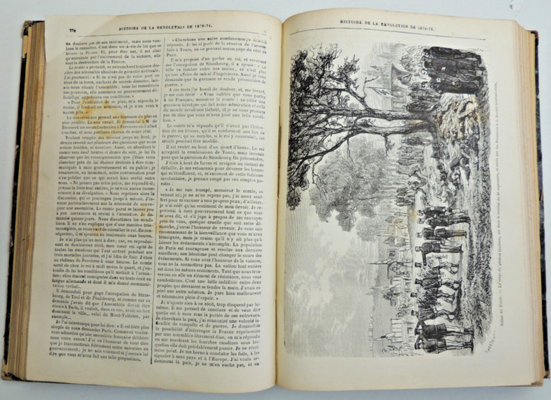 Histoire de la Révolution de 1870-1871. Chute de l’Empire- La guerre- Le gouvernement de défense nationale- La paix- le siège de Paris- La Commune de Paris ; Un volume in 8 290x200mm. demi-cuir vert, faux-titre, portrait de l’auteur en frontispice, titre, 796 pages, texte sur 2 colonnes nombreuses illustrations dans le texte et à pleine page, scènes, portraits, cartes, plans, autographes, Aux bureaux du journal l’Eclipse 1872.