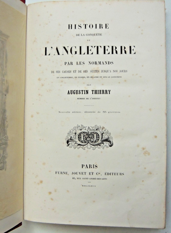 Nouvelle édition revue et corrigée, 3 vol. in-8 reliure uniforme de l'époque demi-chagrin brun, dos à 5 nerfs, Furne, Jouvet et Cie, Paris, 1866, IV-550 ; 510 pp. :Histoire de la Conquête de l'Angleterre par les Normands, de ses Causes et de ses suites jusqu'à nos Jours en Angleterre, en Ecosse, en Irlande et sur le Continent (2 Tomes - Complet) [ On joint : ] Lettres sur l'Histoire de France, pour servir d'Introduction à l'Etude de cette Histoire - Dix Ans d'Etudes historiques