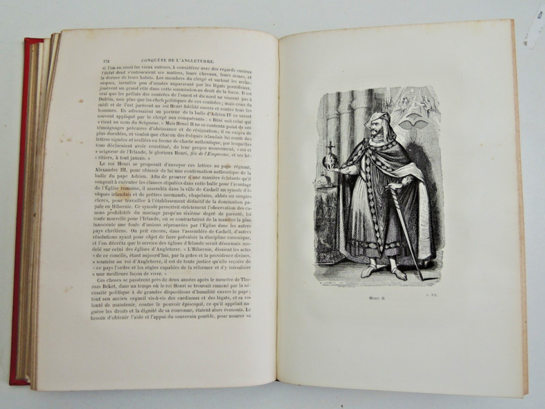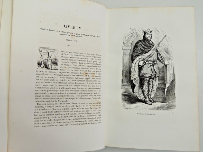 Illustré de gravures hors-texte sous serpente.Rousseurs plus ou moins prononcées suivant les tomes.- Tome I. 456 pages. Introduction. Depuis l'établissement des Bretons jusqu'au IXe siècle. Depuis le premier débarquement des Danois en Angleterre jusqu'à la fin de leur domination. Depuis le soulèvement du peuple anglais contre les favoris normands du roi Edward jusqu'à la bataille de Hastings. Notes et pièces justificatives.- Tome II. 456 pages.Depuis la bataille de Hastings jusqu'à la prise de Chester, dernière ville conquise par les Normands. Depuis la formation du Camp du Refuge dans l'île dEly jusqu'au supplice du dernier chef Saxon. Depuis la querelle du roi Guilaume avec son fils aîné Robert jusqu'au dernier passage de Guillaume sur le continent. Depuis la mort de Guillaume le Conquerant jusqu'à la dernière conspiration générale des Anglais contre les Normands. Notes et pièces justificatives.- Tome III. 447 pages.Depuis la bataille de l'Etendard jusqu'à l'insurrection des Poitevins et des Bretons contre le roi Henry II. Depuis l'origine de la querelle entre le roi Henri II et l'archevêque Thomas jusqu'au meurtre de l'archevêque. depuis l'invasion de l'Irlande par les Normands établis en Angleterre jusqu'à la mort de Henry II. Notes et pièces justificatives.- Tome IV. 431 pages.depuis l'avènement du roi Richard Ier jusqu'à l'exécution du saxon William, surnommé Longue-Barbe. Conclusion : Les Normands et les Bretons du continent, les Anglais et les populations de la Gaule méridionale. Les habitants du Pays de Galles. Les Ecossais. Les Irlandais de race et les Anglo-Normands d'Irlande. Les Anglo-Normands et les Anglais de race. Notes et pièces justificatives...+ Bien complet de l'ATLAS de 13 planches publié en 1843........Beaux Exemplaires...SUPERBEMENT RELIES.........en bon état malgré le léger défaut signalé (good condition in spite of the light defect indicated). bon état