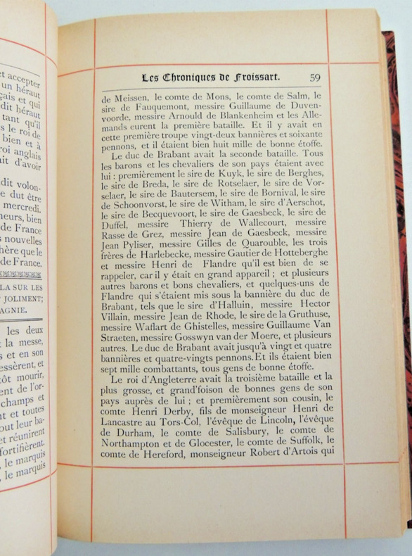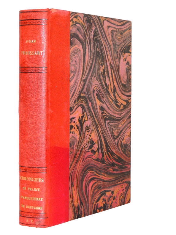 Nouvellement Revues et augmentées d'après les manuscrits avec Notes, Éclaircissements et Glossaire par J. A. C. Buchon., 3 vol. in-4 reliure demi-basane verte, dos à 4 nerfs ornés, A. Desrez, Paris, 1835. Rappel du titre complet : Les Chroniques de Sire Jean Froissart Qui traitent des Merveilleuses Emprises, Nobles Aventures et Faits d'armes advenus en son Temps en France, Angleterre, Bretagne, Bourgogne, Ecosse, Espagne, Portugal et autres parties.
