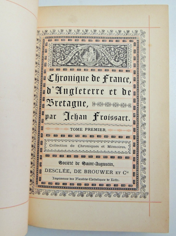 Tome premier, collection de chroniques & de mémoires. Chapitres I-XLIV, Ceci commence a parler du Roi Édouard d'Angleterre à comment le Prince fut reçu a grand honneur de ceux de Bordeaux, et comment le Cardinal de Périgord s'excusa sagement devant le Prince. Complet, volume in8, 240x160, reliure demi cuir, leg. décoloration, très bon état intérieur, 384pp. Joint coupures de journaux. Desclée de Brouwer, 1900 ref/Be207